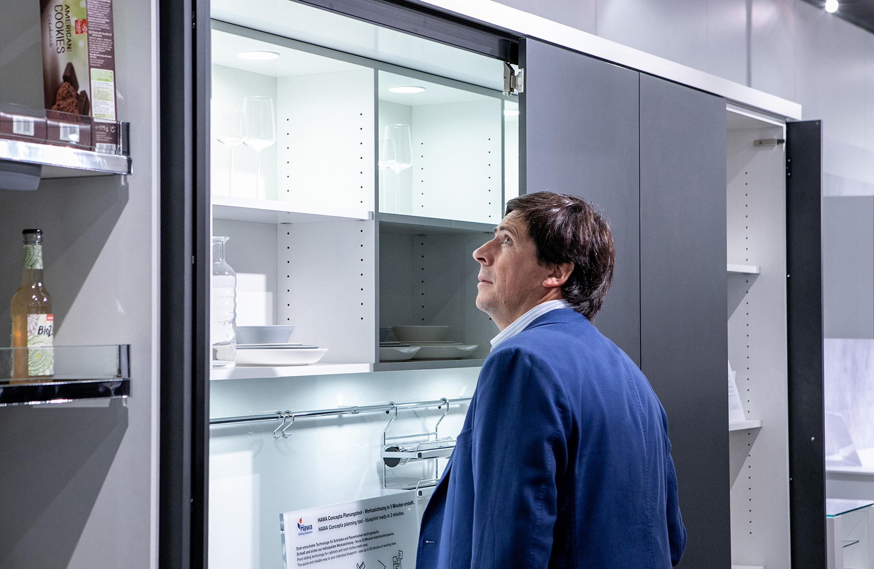 Im Fassadenbereich zeigt HAWA die Frontslide 60/100/140, mit der sich manuelle und automatische Schiebeläden aus Holz, Metall oder Leichtmetall realisieren lassen. Mit vor Ort sind auch die EKU Porta zur Raumgestaltung mit Glastüren bis 100 kg und HAWA Junior 80 B Pocket, ein neuer Schiebebeschlag mit minimaler Einbauhöhe für Wandtaschenlösungen aus Holz bis 80 Kilogramm. Eine neue Produktgeneration der Concepta-Serie für seitlich einschiebbare Möbelfronten kann ebenfalls begutachtet werden.