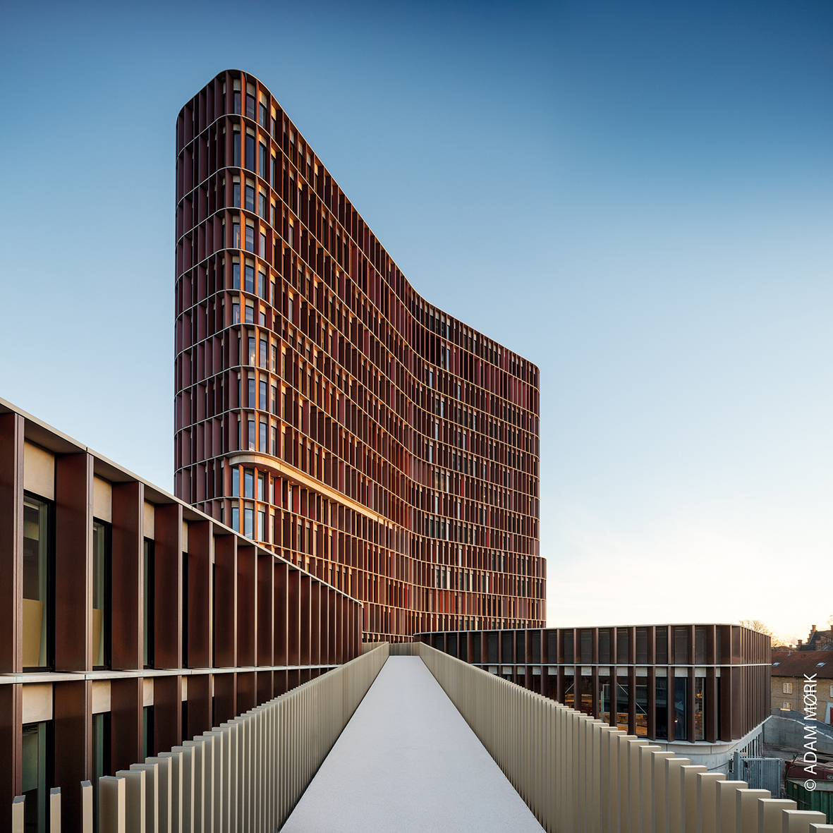Vielfach ausgezeichnet, ist der Maersk Tower bereits ein gutes Jahr nach seiner Eröffnung ein neues Wahrzeichen der dänischen Hauptstadt. Als Teil des Panum-Instituts der Universität Kopenhagen, das den Fachbereich Gesundheit und Medizin beherbergt, ist der dreiflügelige, sanft gewellte Turm das energieeffizienteste Laborgebäude im kleinsten Land Skandinaviens. Regenwasser wird für Toilettenspülung und Gartenbewässerung gesammelt, automatisierte LED-Beleuchtung, Anschluss an das Fernkältesystem, viele Grünflächen und -dächer und vor allem die einzigartige Beschattungslösung tragen dazu bei.