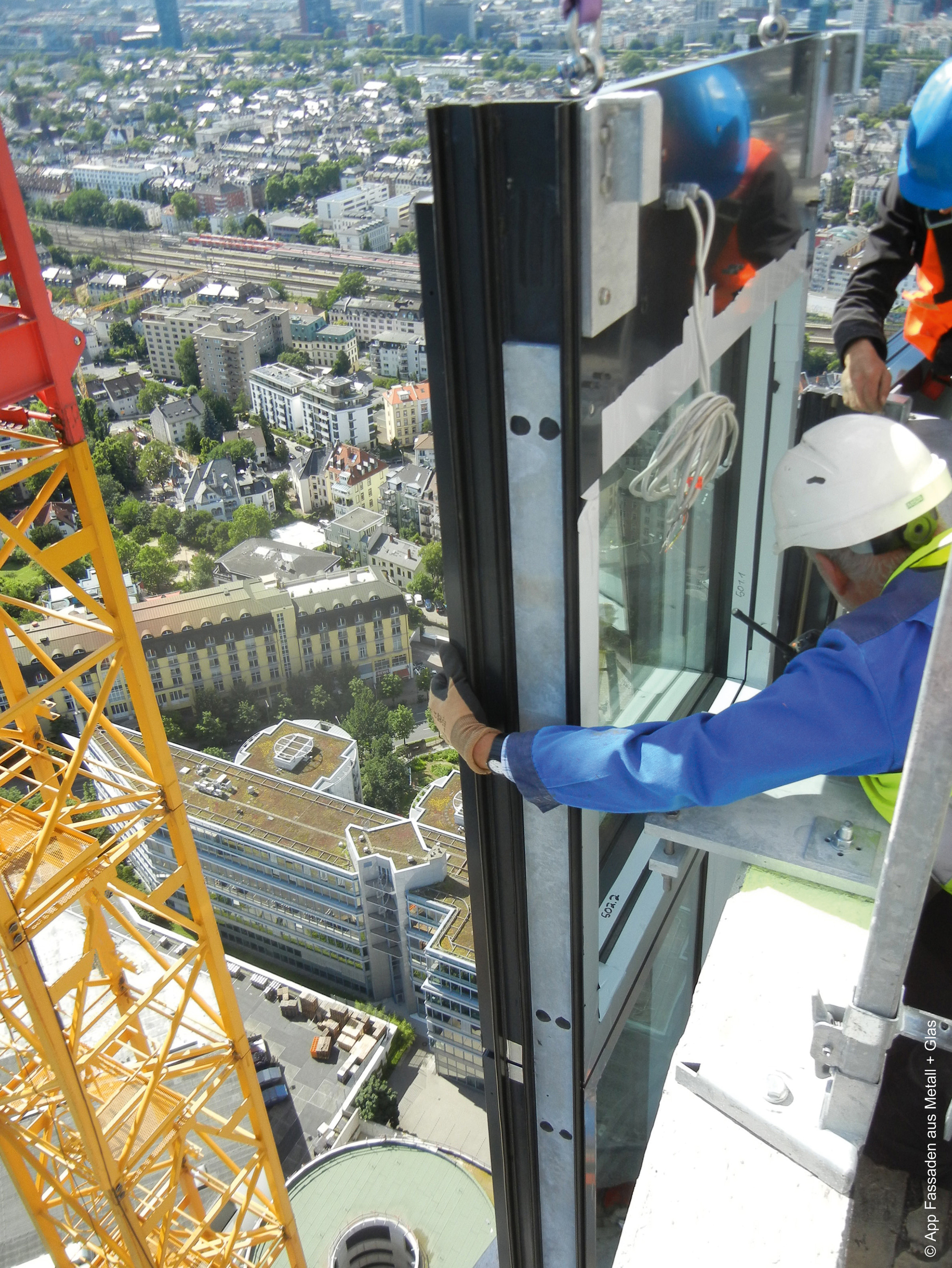 Dank hoch wärmegedämmter Aluminium-Verbundprofile erreicht das System einen hervorragenden Ucw-Wert bis 0,9 W/m²K und erfüllt damit die für den Henniger Turm geforderten ≤ 1,0 W/m²K. Die Vorfertigung der Fassadenelemente in den Werkstätten des Metallbauers ohne Witterungseinflüsse ermöglichte höchste Qualität. Sie ließen sich schnell und präzise vor Ort an der Fassade einhängen. Bauvorhaben in Metropolregionen wie Frankfurt sind von räumlicher Enge und penibler zeitlicher Taktung der Logistik im Umfeld geprägt. Alle Beteiligten profitieren hier von Planungs- und Ausführungssicherheit sowie zeitlicher und wirtschaftlicher Effizienz des WICONA-Fassadensystems.