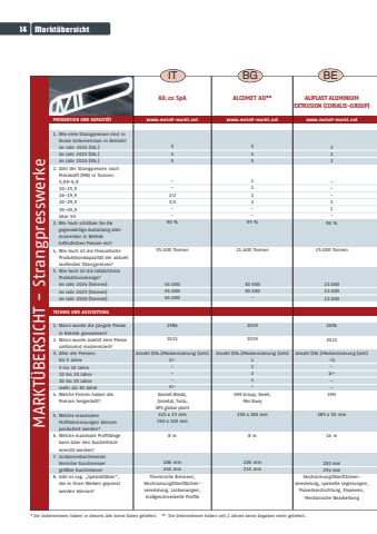 14Markt%u00fcbersichtMARKT%u00dcBERSICHT - StrangpresswerkeAll.co SpAwww.metall-markt.net5552/23/3--90 %55.000 Tonnen45.00045.00045.00019842021Anzahl (Stk.)/Modernisierung (Jahr)2/---3/-Danieli Breda, Cometal, Turla, GPS global plant415 x 25 mm 250 x 100 mm8 m186 mm240 mmThermische Bremsen,Verchromung/Oberfl%u00e4chen -veredelung, Lackierungen, ma%u00dfgeschneiderte ProfileITALCOMET AD**www.metall-markt.net5551112--95 %21.600 Tonnen30.50030.50020192019Anzahl (Stk.)/Modernisierung (Jahr)1121SMS Group, Farell, Mei Ruey200 x 260 mm 8 m106 mm210 mmBGPRODUKTION UND KAPAZIT%u00c4T1. Wie viele Strangpressen sind inIhrem Unternehmen in Betrieb?im Jahr 2024 (Stk.)im Jahr 2025 (Stk.)im Jahr 2026 (Stk.)2. Zahl der Strangpressen nach Presskraft (MN) in Tonnen:5,99-9,910-15,916-19,920-29,930-49,9%u00fcber 503. Wie hoch sch%u00e4tzen Sie die gegenw%u00e4rtige Auslastung aller momentan in Betrieb befind lichen Pressen ein?4. Wie hoch ist die theoretische Produktionskapazit%u00e4t der aktuelllaufenden Strangpressen?5. Wie hoch ist die tats%u00e4chliche Produktionsmenge?im Jahr 2024 (Tonnen)im Jahr 2025 (Tonnen)im Jahr 2026 (Tonnen)TECHNIK UND AUSSTATTUNG1. Wann wurde die j%u00fcngste Presse in Betrieb genommen?2. Wann wurde zuletzt eine Presse umfassend modernisiert?3. Alter der Pressen:bis 5 Jahre5 bis 10 Jahre10 bis 20 Jahre20 bis 30 Jahremehr als 30 Jahre4. Welche Firmen haben die Pressen hergestellt?5. Welche maximalen Profilabmessungen k%u00f6nnen produziert werden?6. Welche maximale Profill%u00e4nge kann %u00fcber den Ausziehtisch erreicht werden?7. Containerdurchmesserkleinster Durchmessergr%u00f6%u00dfter Durchmesser8. Gibt es sog. %u201eSpezialit%u00e4ten%u201c, die in Ihren Werken gepresst werden k%u00f6nnen?BEALIPLAST ALUMINIUM EXTRUSION (CORIALIS-GROUP) www.metall-markt.net222---1190 %25.000 Tonnen22.00022.00022.00020042022Anzahl (Stk.)/Modernisierung (Jahr)-/11/---SMS385 x 50 mm14 m200 mm254 mmVerchromung/Oberfl%u00e4chen -veredelung, spezielle Legierungen, Pulverbeschichtung, Eloxieren,Mechanische Bearbeitung * Die Unternehmen haben in diesem Jahr keine Daten geliefert. ** Die Unternehmen haben seit 2 Jahren keine Angaben mehr geliefert.