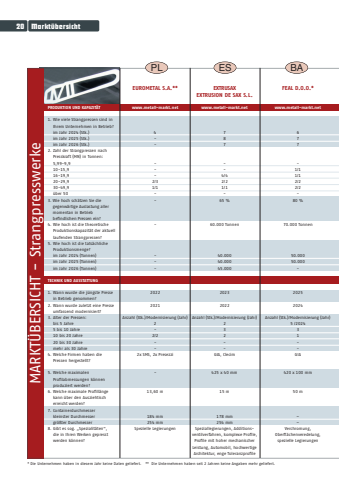 20Markt%u00fcbersichtMARKT%u00dcBERSICHT - StrangpresswerkePRODUKTION UND KAPAZIT%u00c4T1. Wie viele Strangpressen sind inIhrem Unternehmen in Betrieb?im Jahr 2024 (Stk.)im Jahr 2025 (Stk.)im Jahr 2026 (Stk.)2. Zahl der Strangpressen nach Presskraft (MN) in Tonnen:5,99-9,910-15,916-19,920-29,930-49,9%u00fcber 503. Wie hoch sch%u00e4tzen Sie die gegenw%u00e4rtige Auslastung aller momentan in Betrieb befind lichen Pressen ein?4. Wie hoch ist die theoretische Produktionskapazit%u00e4t der aktuelllaufenden Strangpressen?5. Wie hoch ist die tats%u00e4chliche Produktionsmenge?im Jahr 2024 (Tonnen)im Jahr 2025 (Tonnen)im Jahr 2026 (Tonnen)TECHNIK UND AUSSTATTUNG1. Wann wurde die j%u00fcngste Presse in Betrieb genommen?2. Wann wurde zuletzt eine Presse umfassend modernisiert?3. Alter der Pressen:bis 5 Jahre5 bis 10 Jahre10 bis 20 Jahre20 bis 30 Jahremehr als 30 Jahre4. Welche Firmen haben die Pressen hergestellt?5. Welche maximalen Profilabmessungen k%u00f6nnen produziert werden?6. Welche maximale Profill%u00e4nge kann %u00fcber den Ausziehtisch erreicht werden?7. Containerdurchmesserkleinster Durchmessergr%u00f6%u00dfter Durchmesser8. Gibt es sog. %u201eSpezialit%u00e4ten%u201c, die in Ihren Werken gepresst werden k%u00f6nnen?PLEUROMETAL S.A.**www.metall-markt.net4-----2/31/1--20222021Anzahl (Stk.)/Modernisierung (Jahr)22/2--2x SMS, 2x Presezzi13,60 m184 mm254 mmSpezielle LegierungenBAFEAL D.O.O.*www.metall-markt.net677-1/11/12/22/280 %70.000 Tonnen50.00050.000-20252024Anzahl (Stk.)/Modernisierung (Jahr)5 /202431--GIA420 x 100 mm50 m%u2013%u2013Verchromung,Oberfl%u00e4chenveredelung, spezielle LegierungenEXTRUSAXEXTRUSION DE SAX S.L.www.metall-markt.net787--4/42/21/165 %60.000 Tonnen40.00040.00045.00020232022Anzahl (Stk.)/Modernisierung (Jahr)232--GIA, Clecim425 x 40 mm15 m178 mm254 mmSpeziallegierungen, Additions -ventilverfahren, komplexe Profile,Profile mit hoher mechanischerLeistung, Automobil, hochwertigeArchitektur, enge ToleranzprofileES* Die Unternehmen haben in diesem Jahr keine Daten geliefert. ** Die Unternehmen haben seit 2 Jahren keine Angaben mehr geliefert.