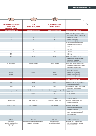 Markt%u00fcbersicht23DEH. H%u00dcTTENBRAUCK PROFIL GMBH*www.metall-markt.net222-1/1-1/160 %14.000 Tonnen950010.000-20212008Anzahl (Stk.)/Modernisierung (Jahr)1/2021-1/2008Cheng Hua, Sutton, SMS175 x 80 mm92 m185 mm210 mmProfilbearbeitung, Beschichtung/EloxalDEHMTGMBH & CO. KG**www.metall-markt.net22---1/11/185 %13.000 Tonnen10.200-20152015Anzahl (Stk.)/Modernisierung (Jahr)-1/20151/2010--SMS Group, GIA200 x 200 mm7,5 m185 mm210 mmVerchromumg/Oberfl%u00e4chenveredelung,spezielle LegierungenATHAMMERER ALUMINIUM INDUSTRIES EXTRUSION GMBHwww.metall-markt.net444%u2013---2/22/265 %43.000 Tonnen30.00035.00033.00020242015Anzahl (Stk.)/Modernisierung (Jahr)211-SMS, Presezzi 440 x 40 mm63 m254 mm305 mmCrashprofile, spezielle und hochfesteLegierungenPRODUKTION UND KAPAZIT%u00c4T1. Wie viele Strangpressen sind inIhrem Unternehmen in Betrieb?im Jahr 2024 (Stk.)im Jahr 2025 (Stk.)im Jahr 2026 (Stk.)2. Zahl der Strangpressen nach Presskraft (MN) in Tonnen:5,99-9,910-15,916-19,920-29,930-49,9%u00fcber 503. Wie hoch sch%u00e4tzen Sie die gegenw%u00e4rtige Auslastung aller momentan in Betrieb befind lichen Pressen ein?4. Wie hoch ist die theoretische Produktionskapazit%u00e4t der aktuelllaufenden Strangpressen?5. Wie hoch ist die tats%u00e4chliche Produktionsmenge?im Jahr 2024 (Tonnen)im Jahr 2025 (Tonnen)im Jahr 2026 (Tonnen)TECHNIK UND AUSSTATTUNG1. Wann wurde die j%u00fcngste Presse in Betrieb genommen?2. Wann wurde zuletzt eine Presse umfassend modernisiert?3. Alter der Pressen:bis 5 Jahre5 bis 10 Jahre10 bis 20 Jahre20 bis 30 Jahremehr als 30 Jahre4. Welche Firmen haben die Pressen hergestellt?5. Welche maximalen Profilabmessungen k%u00f6nnen produziert werden?6. Welche maximale Profill%u00e4nge kann %u00fcber den Ausziehtisch erreicht werden?7. Containerdurchmesserkleinster Durchmessergr%u00f6%u00dfter Durchmesser8. Gibt es sog. %u201eSpezialit%u00e4ten%u201c, die in Ihren Werken gepresst werden k%u00f6nnen?