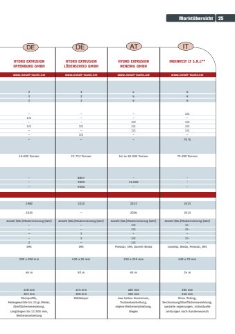 Markt%u00fcbersicht25DEHYDRO EXTRUSIONL%u00dcDENSCHEID GMBHwww.metall-markt.net222---1/11/1-22.752 Tonnen8847900095002010-Anzahl (Stk.)/Modernisierung (Jahr)-11-SMS420 x 20 mm60 m215 mm300 mmK%u00fchlk%u00f6rperDEHYDRO EXTRUSION OFFENBURG GMBHwww.metall-markt.net222-1/1-1/1-16.000 Tonnen-19802020Anzahl (Stk.)/Modernisierung (Jahr)--2SMS200 x 200 mm46 m158 mm203 mmKleinprofile, Metergewichte bis 23 gr./Meter,Oberfl%u00e4chenveredelung,Langl%u00e4ngen bis 11.500 mm,WeiterverarbeitungINDINVEST LT S.R.L**www.metall-markt.net6661/1%u20131/22/21/170 %75.000 Tonnen-20232013Anzahl (Stk.)/Modernisierung (Jahr)3/-2/-1/--Cometal, Breda, Presezzi, SMS430 x 70 mm14 m264 mm140 mmMicro-Tubing,Verchromung/Oberfl%u00e4chen veredelung,spezielle Legierungen, individuelleLeistungen nach KundenwunschATITHYDRO EXTRUSIONNENZING GMBHwww.metall-markt.net444--2/21/11/1-bis zu 60.000 Tonnen31.000-20232006Anzahl (Stk.)/Modernisierung (Jahr)1/11/11/11/1Presezzi, SMS, Danieli Breda210 x 210 mm63 m185 mm260 mmLow Carbon Aluminium,Trockenbearbeitung, eigene Weiterverarbeitung, Biegen