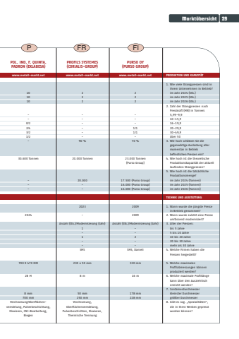 Markt%u00fcbersicht29PRODUKTION UND KAPAZIT%u00c4T1. Wie viele Strangpressen sind inIhrem Unternehmen in Betrieb?im Jahr 2024 (Stk.)im Jahr 2025 (Stk.)im Jahr 2026 (Stk.)2. Zahl der Strangpressen nach Presskraft (MN) in Tonnen:5,99-9,910-15,916-19,920-29,930-49,9%u00fcber 503. Wie hoch sch%u00e4tzen Sie die gegenw%u00e4rtige Auslastung aller momentan in Betrieb befind lichen Pressen ein?4. Wie hoch ist die theoretische Produktionskapazit%u00e4t der aktuelllaufenden Strangpressen?5. Wie hoch ist die tats%u00e4chliche Produktionsmenge?im Jahr 2024 (Tonnen)im Jahr 2025 (Tonnen)im Jahr 2026 (Tonnen)TECHNIK UND AUSSTATTUNG1. Wann wurde die j%u00fcngste Presse in Betrieb genommen?2. Wann wurde zuletzt eine Presse umfassend modernisiert?3. Alter der Pressen:bis 5 Jahre5 bis 10 Jahre10 bis 20 Jahre20 bis 30 Jahremehr als 30 Jahre4. Welche Firmen haben die Pressen hergestellt?5. Welche maximalen Profilabmessungen k%u00f6nnen produziert werden?6. Welche maximale Profill%u00e4nge kann %u00fcber den Ausziehtisch erreicht werden?7. Containerdurchmesserkleinster Durchmessergr%u00f6%u00dfter Durchmesser8. Gibt es sog. %u201eSpezialit%u00e4ten%u201c, die in Ihren Werken gepresst werden k%u00f6nnen?PFRPOL. IND. F. QUINTA.PADRON (EXLABESA)www.metall-markt.net101010--0/22/43/21/2-30.600 Tonnen-2024700 X 470 MM28 M8 mm700 mmVerchromung/Oberfl%u00e4chen -veredelung, Pulverbeschichtung,Eloxieren, CNC-Bearbeitung, BiegenPROFILS SYSTEMES (CORIALIS-GROUP)www.metall-markt.net222----90 %20.000 Tonnen20.000-2023-Anzahl (Stk.)/Modernisierung (Jahr)11--SMS 230 x 50 mm8 m50 mm250 mmVerchromung,Oberfl%u00e4chenveredelung,Pulverbeschichten, Eloxieren,Thermische TrennungFIPURSO OY(PURSO GROUP)www.metall-markt.net222---1/11/170 %23.000 Tonnen(Purso Group)17.500 (Purso Group)16.000 (Purso Group)16.000 (Purso Group)20092009Anzahl (Stk.)/Modernisierung (Jahr)-2--SMS, Danieli 320 mm16 m178 mm228 mm