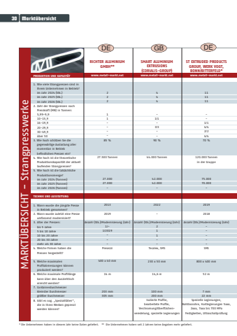30Markt%u00fcbersichtMARKT%u00dcBERSICHT - StrangpresswerkePRODUKTION UND KAPAZIT%u00c4T1. Wie viele Strangpressen sind inIhrem Unternehmen in Betrieb?im Jahr 2024 (Stk.)im Jahr 2025 (Stk.)im Jahr 2026 (Stk.)2. Zahl der Strangpressen nach Presskraft (MN) in Tonnen:5,99-9,910-15,916-19,920-29,930-49,9%u00fcber 503. Wie hoch sch%u00e4tzen Sie die gegenw%u00e4rtige Auslastung aller momentan in Betrieb befind lichen Pressen ein?4. Wie hoch ist die theoretische Produktionskapazit%u00e4t der aktuelllaufenden Strangpressen?5. Wie hoch ist die tats%u00e4chliche Produktionsmenge?im Jahr 2024 (Tonnen)im Jahr 2025 (Tonnen)im Jahr 2026 (Tonnen)TECHNIK UND AUSSTATTUNG1. Wann wurde die j%u00fcngste Presse in Betrieb genommen?2. Wann wurde zuletzt eine Presse umfassend modernisiert?3. Alter der Pressen:bis 5 Jahre5 bis 10 Jahre10 bis 20 Jahre20 bis 30 Jahremehr als 30 Jahre4. Welche Firmen haben die Pressen hergestellt?5. Welche maximalen Profilabmessungen k%u00f6nnen produziert werden?6. Welche maximale Profill%u00e4nge kann %u00fcber den Ausziehtisch erreicht werden?7. Containerdurchmesserkleinster Durchmessergr%u00f6%u00dfter Durchmesser8. Gibt es sog. %u201eSpezialit%u00e4ten%u201c, die in Ihren Werken gepresst werden k%u00f6nnen?DEST EXTRUDED PRODUCTSGROUP, WERK VOGT,BONN/BITTERFELD*www.metall-markt.net111111-1/14/42/24/470 %120.000 Tonnenin der Gruppe75.00070.00020192018Anzahl (Stk.)/Modernisierung (Jahr)---SMS800 x 400 mm52 m7 mm22 mmSpezielle Legierungen, Nahtlosrohre, Hartlegierungen 5xxx,2xxx, 7xxx bis 700 MPaFestigkeiten, Ultraschallpr%u00fcfungDERICHTER ALUMINIUM GMBH**www.metall-markt.net22211--85 %27.500 Tonnen27.00027.000-20132019Anzahl (Stk.)/Modernisierung (Jahr)1/-1/2019--Presezzi 400 x 40 mm14 m203 mm305 mmGBSMART ALUMINIUM EXTRUSIONS (CORIALIS-GROUP)www.metall-markt.net4441/1-3/3-90 %44.000 Tonnen42.00042.0002022Anzahl (Stk.)/Modernisierung (Jahr)211-Tecalex, SMS230 x 50 mm14,6 m100 mm200 mmIsolierte Profile, bearbeitete Profile,Verchromung/Oberfl%u00e4chen veredelung, spezielle Legierungen* Die Unternehmen haben in diesem Jahr keine Daten geliefert. ** Die Unternehmen haben seit 2 Jahren keine Angaben mehr geliefert.
