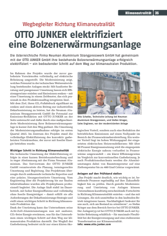 Klimaneutralit%u00e4t35Im Rahmen des Projekts wurde der zuvor gas -beheizte Vorw%u00e4rmofen vollst%u00e4ndig auf elektrischeBeheizung umgestellt. Die Modernisierung zeigt,welches Potenzial in der technischen Weiterentwicklung bestehender Anlagen steckt: Mit fundierter Beratung und passgenauer Umsetzung lassen sich Effizienzgewinne erzielen und Emissionen senken %u2013 miteiner Umsetzung in einem Zeitfenster, das sich praxisnah in den Produktionsalltag integrieren l%u00e4sst. Mit dem Ziel, ihren CO2-Fu%u00dfabdruck signifikant zusenken und einen aktiven Beitrag zur industriellenDekarbonisierung zu leisten, hat die Neuman Aluminium Strangpresswerk GmbH ihr Potenzial zurEmissions-Reduktion mit OTTO JUNKER an derSeite untersucht und daf%u00fcr durch eine ma%u00dfgeschneiderte Modernisierung ihrer Bolzenerw%u00e4rmungsanlage in kurzer Zeit den Weg geebnet. Die Umsetzungder Modernisierungsma%u00dfnahme erfolgte im erstenQuartal 2025. Im Zentrum des Projekts stand dievollst%u00e4ndige Elektrifizierung des konvektiv gasbeheizten Vorw%u00e4rmofens, der zuvor mit fossiler Energie betrieben wurde. Wichtiger Schritt in Richtung Klimaneutralit%u00e4tDie technische Umsetzung der Elektrifizierung erfolgte in einer kurzen Betriebsunterbrechung undin enger Abstimmung mit der Firma Neuman Aluminium. Das Serviceteam der OTTO JUNKERGmbH verantwortete die Planung, termingerechteUmsetzung und Begleitung. Das Projektteam %u00fcberzeugte durch umfassende technische Expertise undeine pr%u00e4zise, l%u00f6sungsorientierte Umsetzung. VomEngineering %u00fcber die Projektierung bis zur finalenInbetriebnahme wurden alle Projektphasen professionell begleitet. Die Anlage l%u00e4uft stabil im Dauerbetrieb, mit hoher Energieeffizienz und vollst%u00e4ndigohne fossile Energietr%u00e4ger %u2013 damit erf%u00fcllt sie alleAnforderungen der Dekarbonisierungs-Strategie undstellt einen wichtigen Schritt in Richtung klimaneutrale Produktion dar. Dank der Umr%u00fcstung kann das Unternehmen seineAcht-Zoll-Aluminiumstangen nun mit sauberer,CO2-freier Energie erw%u00e4rmen, was f%u00fcr das Unternehmen einen wichtigen Schritt auf dem Weg zur klimaneutralen Produktion darstellt. Der Wegfall derGasbeheizung bedeutet nicht nur einen klaren %u00f6kologischen Vorteil, sondern auch eine Reduktion derbetrieblichen Emissionen auf einen Nullpunkt imBereich der Prozessw%u00e4rmebereitstellung. Ein weiterer Vorteil liegt im hohen Wirkungsgrad der eingesetzten elektrischen Heizwendelkerzen: Mit %u00fcber90 Prozent Energieausnutzung wird die eingespeisteelektrische Energie nahezu verlustfrei in Prozessw%u00e4rme umgewandelt %u2013 ein klarer Effizienzgewinnim Vergleich zur konventionellen Gasbeheizung. Jenach Produktionsdurchsatz werden die Aluminiumstangen dabei von Raumtemperatur auf eineZieltemperatur bis zu 480 Grad Celsius vorgew%u00e4rmt. Anlagen auf den Pr%u00fcfstand stellen%u201eDas Projekt macht deutlich, wie wichtig es ist, bestehende Prozesse regelm%u00e4%u00dfig auf ihre Zukunftsf%u00e4higkeit hin zu pr%u00fcfen. Durch gezielte Modernisierung und Umr%u00fcstung von Anlagen k%u00f6nnenUnternehmen kurzfristig entscheidende Fortschrittein Richtung Klimaneutralit%u00e4t erzielen %u2013 und das mitL%u00f6sungen, die sich unmittelbar in den laufenden Betrieb integrieren lassen. Nachhaltigkeit bedeutet f%u00fcruns auch, sich am Bestand zu orientieren%u201c, so StefanKrieger aus dem Bereich Service bei OTTO JUNKER. Der Anlagentyp ist bei OTTO JUNKER auch mit hybrider Beheizung erh%u00e4ltlich %u2013 f%u00fcr maximale Flexibilit%u00e4t bei der Energieversorgung und eine stufenweiseTransformation zur Klimaneutralit%u00e4t. Info: www.otto.junker.com OTTO JUNKER elektrifiziert eine Bolzenerw%u00e4rmungsanlage Wegbegleiter Richtung Klimaneutralit%u00e4t Die %u00f6sterreichische Firma Neuman Aluminium Strangpresswerk GmbH hat gemeinsammit der OTTO JUNKER GmbH ihre bestehende Bolzenerw%u00e4rmungs anlage erfolgreichelektrifiziert %u2013 ein bedeutender Schritt auf dem Weg zur klimaneutralen Produktion. Foto: OTTO JUNKER GmbHOtto Schatko, Technische Leitung bei Neuman Aluminium Strangpressen, und Stefan Krieger, Sales Engineer, vor der modernisierten Anlage