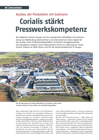 38UnternehmenDiese Akquisition f%u00fcgt sich ein in die Wachstumsstrategie von Corialis, die europ%u00e4ische Pr%u00e4senz zuintensivieren und das Produktportfolio durch hochwertige L%u00f6sungen zu erweitern. Gutmann bringtnicht nur Fertigungskapazit%u00e4ten, sondern auch technisches Know-how und eine starke Marktpositionin Deutschland mit. Herzst%u00fcck der Gruppe sind Aliplast Aluminium Extrusion in Belgien und Polenund vier moderne Presswerke in Portugal, U.K.,Frankreich und jetzt auch Deutschland, die mithochautomatisierten Fertigungsanlagen Profile f%u00fcrunterschiedlichste Anwendungen herstellen. Mitrund 3000 Mitarbeitenden in Europa produziert Corialis ma%u00dfgeschneiderte L%u00f6sungen f%u00fcr industrielleAnwendungen.Mit den drei Gutmann-Pressen %u2013 1600, 2500 und3500 Tonnen %u2013 produziert Corialis auf 18 Strangpressen hochwertige, innovative und ma%u00dfgeschneiderte Aluminiumprofile f%u00fcr ihren Unternehmensbereich Architectural Systems sowie f%u00fcr Dritt kunden.Die Corialis Group %u2013 gegr%u00fcndet 1984 als belgischesUnternehmen %u2013 hat sich %u00fcber Jahrzehnte hinweg zueinem f%u00fchrenden, vollst%u00e4ndig vertikal integriertenAnbieter innovativer Aluminium Engineered Solu- Corialis st%u00e4rkt PresswerkskompetenzAusbau der Produktion mit GutmannDie belgische Corialis-Gruppe hat die europ%u00e4ischen Aktivit%u00e4ten der GutmannGroup aus Wei%u00dfenburg %u00fcbernommen und setzt damit ein klares Signal f%u00fcrden Ausbau ihrer Produktionskapazit%u00e4ten im Bereich Strangpressprofile. Die Transaktion markiert einen bedeutenden Schritt zur St%u00e4rkung der indus -triellen Pr%u00e4senz im DACH-Raum und f%u00fcr die Aluminiumbranche in Europa.Mit der %u00dcbernahme der Europa-Aktivit%u00e4ten von Gutmann setzt Corialis ein klares Zeichen f%u00fcr den Ausbau der Produktionskapazit%u00e4tenFotos: Corialis