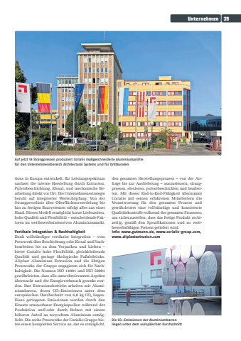Unternehmen39tions in Europa entwickelt. Ihr Leistungsspektrumumfasst die interne Herstellung durch Extrusion,Pulverbeschichtung, Eloxal, und mechanische Bearbeitung direkt vor Ort. Die Unternehmensstrategieberuht auf integrierter Wertsch%u00f6pfung: Von derStrangpresslinie %u00fcber Oberfl%u00e4chenveredelung bishin zu fertigen Bausystemen erfolgt alles aus einerHand. Dieses Modell erm%u00f6glicht kurze Lieferzeiten,hohe Qualit%u00e4t und Flexibilit%u00e4t %u2013 entscheidende Faktoren im wettbewerbsintensiven Aluminiummarkt.Vertikale Integration & NachhaltigkeitDank vollst%u00e4ndiger vertikaler Integration %u2013 vomPresswerk %u00fcber Beschichtung oder Eloxal und Nachbearbeiten bis zu dem Verpacken und Liefern %u2013bietet Corialis hohe Flexibilit%u00e4t, gleichbleibendeQualit%u00e4t und geringe %u00f6kologische Fu%u00dfabdr%u00fccke. Aliplast Aluminium Extrusion und die %u00fcbrigenPresswerke der Gruppe engagieren sich f%u00fcr Nachhaltigkeit. Die Normen ISO 14001 und ISO 50001gew%u00e4hrleisten, dass alle umweltrelevanten Aspekte%u00fcberwacht und der Energieverbrauch gesenkt werden. Ihre Extrusionsbetriebe arbeiten mit Alumi -niumbarren, deren CO2-Emissionen unter demeurop%u00e4ischen Durchschnitt von 6,8 kg CO2 liegen.Diese geringeren Emissionen werden durch denEinsatz erneuerbarer Energiequellen w%u00e4hrend derProduktion und/oder durch Bolzen mit einemh%u00f6heren Anteil an recyceltem Aluminium erm%u00f6glicht. Die sechs Presswerke der Corialis-Gruppe bieten einen kompletten Service an, der es erm%u00f6glicht,den gesamten Herstellungsprozess %u2013 von der Anfrage bis zur Auslieferung %u2013 auszusteuern: strangpressen, eloxieren, pulverbeschichten und bearbeiten. Mit dieser End-to-End-F%u00e4higkeit %u00fcbernimmtCorialis mit seinen erfahrenen Mitarbeitern dieVerantwortung f%u00fcr den gesamten Prozess undgew%u00e4hrleistet eine vollst%u00e4ndige und konsistenteQualit%u00e4tskontrolle w%u00e4hrend des gesamten Prozesses,um sicherzustellen, dass das fertige Produkt rechtzeitig, gem%u00e4%u00df den Spezifikationen und zu wett -bewerbsf%u00e4higen Preisen geliefert wird. Info: www.gutmann.de, www.corialis-group.com,www.aliplastextrusion.com Auf jetzt 18 Strangpressen produziert Corialis ma%u00dfgeschneiderte Aluminiumprofilef%u00fcr den Unternehmensbereich Architectural Systems und f%u00fcr DrittkundenDie CO2-Emissionen der Aluminiumbarren liegen unter dem europ%u00e4ischen Durchschnitt