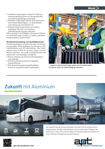 Aktuell5%u2022 Crashfeste Legierungen werden f%u00fcr Fahrzeug -sicherheitskomponenten wie Energieabsorberund Seitenaufpralltr%u00e4ger entwickelt.%u2022 Hochfeste Legierungen dienen dem Maschinenund Schienenfahrzeugbau, wo Belastbarkeitunter Spannung entscheidend ist.%u2022 Pr%u00e4zisionslegierungen bieten ein leichtes, langlebiges Material, was modernearchitektonische Systeme erfordern.Dabei garantiert die F%u00e4higkeit, Extrusions-Toleranzen innerhalb enger Grenzen zu halten, gleichbleibende Qualit%u00e4t in jedem Profil.Oberfl%u00e4chenveredelung und Qualit%u00e4tskontrolleVeredelungsanlagen erweitern den Wert der Strangpressprodukte durch Verfahren wie Eloxieren, Pulverbeschichten und KTL-Beschichten. Das Unternehmen kann Profile bis zu einer L%u00e4nge von achtMetern eloxieren, was gro%u00dfe architektonische undindustrielle Anwendungen erm%u00f6glicht:%u2022 Eloxal verbessert die Korrosionsbest%u00e4ndigkeitund %u00c4sthetik,%u2022 Pulverbeschichtung sorgt f%u00fcr langlebigeFarboberfl%u00e4chen,%u2022 KTL-Beschichtung bietet gleichm%u00e4%u00dfigen Schutz in anspruchsvollen Umgebungen.%u2026bewahren, gleichzeitig Energie sparen und die Kondensation von Wasser sowie die L%u00e4rmbel%u00e4stigung reduzieren