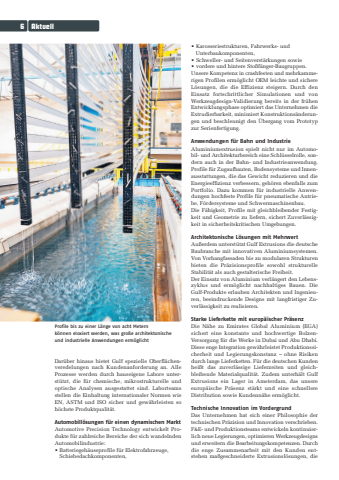 6Aktuell%u2022 Karosseriestrukturen, Fahrwerks- undUnterbaukomponenten, %u2022 Schweller- und Seitenverst%u00e4rkungen sowie %u2022 vordere und hintere Sto%u00dff%u00e4nger-Baugruppen.Unsere Kompetenz in crashfesten und mehrkammerigen Profilen erm%u00f6glicht OEM leichte und sichereL%u00f6sungen, die die Effizienz steigern. Durch denEinsatz fortschrittlicher Simulationen und vonWerkzeugdesign-Validierung bereits in der fr%u00fchenEntwicklungsphase optimiert das Unternehmen dieExtrudierbarkeit, minimiert Konstruktions%u00e4nderungen und beschleunigt den %u00dcbergang vom Prototypzur Serienfertigung.Anwendungen f%u00fcr Bahn und IndustrieAluminiumextrusion spielt nicht nur im Automobil- und Architekturbereich eine Schl%u00fcsselrolle, sondern auch in der Bahn- und Industrieanwendung.Profile f%u00fcr Zugaufbauten, Bodensysteme und Innenausstattungen, die das Gewicht reduzieren und dieEnergieeffizienz verbessern, geh%u00f6ren ebenfalls zumPortfolio. Dazu kommen f%u00fcr industrielle Anwendungen hochfeste Profile f%u00fcr pneumatische Antrie -be, F%u00f6rdersysteme und Schwermaschinenbau.Die F%u00e4higkeit, Profile mit gleichbleibender Festigkeit und Geometrie zu liefern, sichert Zuverl%u00e4ssigkeit in sicherheitskritischen Umgebungen.Architektonische L%u00f6sungen mit MehrwertAu%u00dferdem unterst%u00fctzt Gulf Extrusions die deutscheBaubranche mit innovativen Aluminiumsystemen.Von Vorhangfassaden bis zu modularen Strukturenbieten die Pr%u00e4zisionsprofile sowohl strukturelleStabilit%u00e4t als auch gestalterische Freiheit.Der Einsatz von Aluminium verl%u00e4ngert den Lebenszyklus und erm%u00f6glicht nachhaltiges Bauen. DieGulf-Produkte erlauben Architekten und Ingenieuren, beeindruckende Designs mit langfristiger Zuverl%u00e4ssigkeit zu realisieren.Starke Lieferkette mit europ%u00e4ischer Pr%u00e4senzDie N%u00e4he zu Emirates Global Aluminium (EGA)sichert eine konstante und hochwertige BolzenVersorgung f%u00fcr die Werke in Dubai und Abu Dhabi.Diese enge Integration gew%u00e4hrleistet Produktionssicherheit und Legierungskonstanz %u2013 ohne Risikendurch lange Lieferketten. F%u00fcr die deutschen Kundenhei%u00dft das zuverl%u00e4ssige Lieferzeiten und gleich -bleibende Materialqualit%u00e4t. Zudem unterh%u00e4lt GulfExtrusions ein Lager in Amsterdam, das unsereeurop%u00e4ische Pr%u00e4senz st%u00e4rkt und eine schnellereDistribution sowie Kundenn%u00e4he erm%u00f6glicht.Technische Innovation im VordergrundDas Unternehmen hat sich einer Philosophie dertechnischen Pr%u00e4zision und Innovation verschrieben.F&E- und Produktionsteams entwickeln kontinuierlich neue Legierungen, optimieren Werkzeugdesignsund erweitern die Bearbeitungskompetenzen. Durchdie enge Zusammenarbeit mit den Kunden ent -stehen ma%u00dfgeschneiderte Extrusionsl%u00f6sungen, dieDar%u00fcber hinaus bietet Gulf spezielle Oberfl%u00e4chenveredelungen nach Kundenanforderung an. AlleProzesse werden durch hauseigene Labore unterst%u00fctzt, die f%u00fcr chemische, mikrostrukturelle undoptische Analysen ausgestattet sind. Laborteamsstellen die Einhaltung internationaler Normen wieEN, ASTM und ISO sicher und gew%u00e4hrleisten soh%u00f6chste Produktqualit%u00e4t.Automobill%u00f6sungen f%u00fcr einen dynamischen MarktAutomotive Precision Technology entwickelt Produkte f%u00fcr zahlreiche Bereiche der sich wandelndenAutomobilindustrie:%u2022 Batteriegeh%u00e4useprofile f%u00fcr Elektrofahrzeuge,Schiebedachkomponenten, Profile bis zu einer L%u00e4nge von acht Metern k%u00f6nnen eloxiert werden, was gro%u00dfe architektonischeund industrielle Anwendungen erm%u00f6glicht