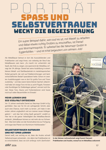 202617PORTRAT SPASS UND SELBSTVERTRAUENWECKT DIE BEGEISTERUNGEin super Beispiel daf%u00fcr, wie cool es ist, mit Metall zu arbeitenund dabei etwas richtig Gro%u00dfes zu erschaffen, ist Daniel aus Wurmannsquick. Er arbeitet bei der Neumayr GmbH in Eggenfelden %u2013 und ist total begeistert von seinem Job!******************************************************************************************************************************************************************************Als Metallbauer betreut er dort die Auszubildenden undPraktikanten und zeigt ihnen, wie vielseitig der Beruf desMetallbauers sein kann. %u201eEs macht mir unheimlich vielSpa%u00df, den Kids zu zeigen, wie spannend der Metallbau ist%u201c,sagt der 34-J%u00e4hrige. Daniel hat seine Ausbildung in einemkleinen Metall- und Stahlbaubetrieb im niederbayerischenRottal gemacht, der sich auf Stalleinrichtungen und landwirtschaftlichen Bedarf spezialisiert hatte. Schon im zweiten Ausbildungsjahr war er dort f%u00fcr gro%u00dfe Tore und T%u00fcrenzust%u00e4ndig %u2013 und das waren keine kleinen Sachen! %u201eManchmal habe ich riesige Tore mit bis zu acht Fl%u00fcgeln, Fensternoder Rundb%u00f6gen f%u00fcr Stallanlagen gebaut%u201c, erinnert sich Daniel. Diese Tore, Z%u00e4une und Futterstationen sind heutenoch auf vielen Bauernh%u00f6fen im Einsatz!Mehr lernen und die Vielfalt entdeckenVor 13 Jahren wechselte Daniel zur Neumayr GmbH in Eggenfelden. Das war f%u00fcr ihn ein aufregender Schritt, aberauch eine Chance, noch mehr zu lernen. %u201eIch habe in denersten Jahren unglaublich viel von meinen neuen Kollegengelernt %u2013 und das hat richtig Spa%u00df gemacht%u201c, erz%u00e4hlt er.Hier hat er die ganze Vielseitigkeit des Metallbau-Berufsentdeckt. %u201eMetallbauer k%u00f6nnen so viel mehr als nur Schwei%u00dfen. Man lernt alles von der Konstruktion bis zur Fertigungund sogar das Planen von Aluminium-Holzfassaden.%u201cSelbstvertrauen aufbauen und mit Spa%u00df lernenDaniel wei%u00df, wie wichtig es ist, dass die Azubis schnellSelbstvertrauen entwickeln. %u201eVor allem bei Praktikanten istes entscheidend, dass sie sich anfangs nicht %u00fcberfordertIn der kleinen Lehrwerkstatt zeigt Daniel Clement Praktikanten und Azubis, worauf es im Metallbau ankommtFotos: metall-markt.net