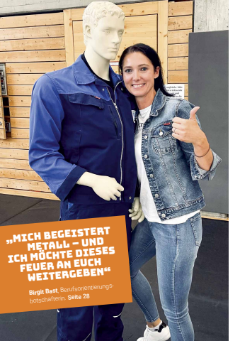 2026Foto: MEINMetall%u201eMich begeistert Metall %u2013 und ich m%u00f6chte dieses Feuer an Euch weitergeben%u201c Birgit Bast, Berufs orientierungs - botschafterin. Seite 28