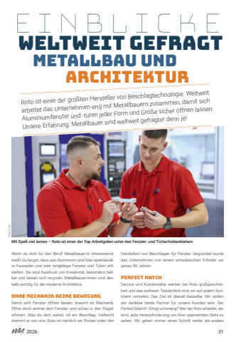 Roto ist einer der gr%u00f6%u00dften Hersteller von Beschlagtechnologie. Weltweitarbeitet das Unternehmen eng mit Metallbauern zusammen, damit sichAluminiumfenster und -t%u00fcren jeder Form und Gr%u00f6%u00dfe sicher %u00f6ffnen lassen.Unsere Erfahrung: Metallbauer sind weltweit gefragter denn je!**********************************************************************************************************************************************************************************************************Weltweit gefragtMetallbau und Architektur 202631Herstellern von Beschl%u00e4gen f%u00fcr Fenster. Gegr%u00fcndet wurdedas Unternehmen von einem schw%u00e4bischen Erfinder vorgenau 90 Jahren.Perfect MatchService und Kundenn%u00e4he werden bei Roto gro%u00dfgeschrieben und das weltweit. Tats%u00e4chlich sind wir auf jedem Kontinent vertreten. Das Ziel ist %u00fcberall dasselbe: Wir wollender denkbar beste Partner f%u00fcr unsere Kunden sein. DerPerfect Match! Klingt schwierig? Wer bei Roto arbeitet, derlernt, jede Herausforderung von ihrer spannenden Seite zusehen. Wir gehen immer einen Schritt weiter als andereWenn du dich f%u00fcr den Beruf Metallbauer/in interessierst,wei%u00dft du l%u00e4ngst, dass aus Aluminium und Glas spektakul%u00e4re Fassaden und sehr langlebige Fenster und T%u00fcren entstehen. Sie sind Ausdruck von Kreativit%u00e4t, besonders haltbar und lassen sich recyceln. Metallbauer/innen sind deshalb wichtig f%u00fcr die moderne Architektur. Ohne Mechanik keine BewegungDamit sich Fenster %u00f6ffnen lassen, braucht es Mechanik.%u00d6ffne doch einmal dein Fenster und schau in den Fl%u00fcgelrahmen: Was du dort siehst, ist ein Beschlag. Vielleichtstammt er von uns. Roto ist n%u00e4mlich ein Pionier unter denMit Spa%u00df viel lernen %u2013 Roto ist einer der Top-Arbeitgeber unter den Fenster- und T%u00fcrtechnikanbieternEINBLICKEFotos: Roto