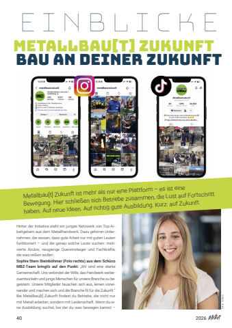 402026Hinter der Initiative steht ein junges Netzwerk von Top-Arbeitgebern aus dem Metallhandwerk. Dazu geh%u00f6ren Unternehmen, die wissen, dass gute Arbeit nur mit guten Leutenfunktioniert %u2013 und die genau solche Leute suchen: motivierte Azubis, neugierige Quereinsteiger und Fachkr%u00e4fte,die was rei%u00dfen wollen.Sophie Stern Steinb%u00f6hmer (Foto rechts) aus dem Sch%u00fcco MBZ-Team bringt%u2019s auf den Punkt:%u201eWir sind eine starke Gemeinschaft. Uns verbindet der Wille, das Handwerk weiterzuentwickeln und junge Menschen f%u00fcr unsere Branche zu begeistern. Unsere Mitglieder tauschen sich aus, lernen voneinander und machen sich und die Branche fit f%u00fcr die Zukunft.%u201cBei Metallbau[t] Zukunft findest du Betriebe, die nicht nurmit Metall arbeiten, sondern mit Leidenschaft. Wenn du eine Ausbildung suchst, bei der du was bewegen kannst %u2013EINBLICKEMETALLBAU[T] ZUKUNFT BAU AN DEINER ZUKUNFTBewegung. Hier schlie%u00dfen sich Betriebe zusammen, die Lust auf Fortschritthaben. Auf neue Ideen. Auf richtig gute Ausbildung. Kurz: auf Zukunft.Fotos: Sch%u00fcco