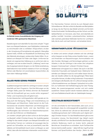 442026Bauteile eignen sich ebenfalls f%u00fcr das erste Lehrjahr.%u201c F%u00fcgenkann zum Beispiel bedeuten, zwei Stahlplatten miteinanderzu verschrauben oder zu verkleben. Klingt einfach, ist aberin der Umsetzung oft komplizierter als gedacht. ManuellesSpanen hei%u00dft, mithilfe von Muskelkraft und Werkzeug Teiledes Materials abzutragen, sodass eben Sp%u00e4ne fallen. Du arbeitest zum Beispiel mit Feilen oder S%u00e4gen. Umformen bedeutet, ein sogenanntes Halbzeug so zu verformen oder zuverbiegen, wie man es eben braucht. %u201eHalbzeug%u201c nennt mandas Ausgangsmaterial %u00fcbrigens vor der Weiterverarbeitung,Stahl bekommt man n%u00e4mlich meistens in Form von Stangen,Rohren oder Blechen mit verschiedenen Querschnitten, diedann eben Halbzeuge hei%u00dfen. *******************************************************Alles muss genau passen*******************************************************Qualit%u00e4tsmanagement steht f%u00fcr Lehrlinge im ersten Lehrjahrebenfalls auf dem Programm. Sind die Bohrungen an derrichtigen Stelle, passt der Winkel, stimmen die Abst%u00e4nde?Sieht die Schwei%u00dfnaht gut aus, wurde nichts vergessen?Fehler- und Ursachensuche will gelernt sein. Zu den klassischen Lehrlingsarbeiten z%u00e4hlt gerade am Anfang auch die Reinigung, Pflege und Instandhaltung vonWerkzeugen und Maschinen. Dabei kannst du die Funktionsweise der einzelnen Maschinen und Werkzeuge kennenlernen. Beispiele hierf%u00fcr sind das Nachf%u00fcllen vonK%u00fchlfl%u00fcssigkeit, das Schmieren von Maschinenkomponenten oder das Entfernen von Metallsp%u00e4nen. %u201eIm zweiten Lehrjahr geht es dann schon an die komplexeren Bauteile%u201c, erkl%u00e4rt Christian Krause. Der Ausbildungsplanschl%u00e4gt f%u00fcr das zweite Lehrjahr zum Beispiel Schwei%u00dfen undthermisches Trennen vor. Letzteres ist sozusagen das Gegenteil von Schwei%u00dfen, wo man ja (vereinfacht) zwei Metallteile und Schwei%u00dfdraht durch einen Lichtbogen so weiterhitzt, dass alle drei teilweise miteinander verschmelzen. F%u00fcr thermisches Trennen nimmst du zum Beispiel einenSchneidbrenner. Mit dem erhitzt du Bauteile wie Blechplattenso lange, bis die Flamme das Metall schmilzt und f%u00f6rmlichhindurchschneidet. Die Behandlung und der Schutz von Metalloberfl%u00e4chen vor Korrosion, also Rost, sind ebenfalls eingro%u00dfes Lernfeld. Verzinken, pulverbeschichten, lackierenoder wachsen, jede dieser Methoden hat ihre Vor- und Nachteile, die du nach und nach kennen- und einsetzen lernst.*******************************************************Verantwortliche T%u00e4tigkeiten*******************************************************Im dritten und vierten Lehrjahr arbeiten sich die Lehrlingeschon langsam an den Status eines Gesellen heran. %u201eLesenund Anwenden von Bauzeichnungen, Kommunikation mitdem Kunden, Montagen und Demontagen geh%u00f6ren zu denArbeiten, in die die Lehrlinge in den ersten drei Lehrjahrenlangsam hineinwachsen%u201c, erl%u00e4utert Christian Krause. Idealerweise schnupperst du in dieser Zeit auch in die Elektrotechnik, Pneumatik und Hydraulik hinein. Elektrische Torantriebe zum Beispiel musst du nicht selber bauen k%u00f6nnen,aber als Geselle solltest du die dazugeh%u00f6rigen Pl%u00e4ne lesenund pr%u00fcfen k%u00f6nnen, ob alles richtig funktioniert. Pneumatischsind %u00fcbrigens alle Bauteile, die mit Luftdruck bewegt werden,Luftschmiedeh%u00e4mmer zum Beispiel. Hydraulisch ist so %u00e4hnlich, nur funktioniert die Kraft%u00fcbertragung hier %u00fcber Fl%u00fcssigkeiten, die zusammengepresst werden und sich wiederausdehnen. Dieses System steckt meistens dahinter, wennsich eine Radladerschaufel oder ein Gabelstapler bewegt. *******************************************************Digitales Berichtsheft *******************************************************Um die Lerninhalte f%u00fcr dich festzuhalten, aber auch, um zubest%u00e4tigen, dass du ordnungsgem%u00e4%u00df ausgebildet wordenbist, f%u00fchrst du w%u00e4hrend der Lehrzeit ein Berichtsheft. %u201eDerAusbildungsnachweis darf mittlerweile auch digital sein%u201c,sagt Christian Krause. F%u00fcr das Metallhandwerk gibt es eineinnovative L%u00f6sung. Die Berichtsheft App Metall macht die alte, schriftliche Form des Berichtshefts %u00fcberfl%u00fcssig: Dieeinfache Bedienung macht es Azubis leicht, jederzeit Berichte am Smartphone zu schreiben. Auch Fachberichtek%u00f6nnen leicht erstellt werden %u2013 dabei hilft der Zugriff auf dieKamera- und Sprachfunktion des Handys. %u201eWenn du w%u00e4hIm Betrieb lernen Auszubildende den Umgang mit modernen CNC-gesteuerten MaschinenFoto: pixabaySo l%u00e4uft%u2018s WEGE NACH OBEN