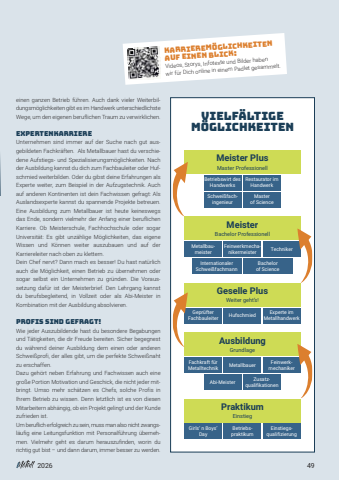 202649einen ganzen Betrieb f%u00fchren. Auch dank vieler Weiterbildungsm%u00f6glichkeiten gibt es im Handwerk unterschiedlichsteWege, um den eigenen beruflichen Traum zu verwirklichen.ExpertenkarriereUnternehmen sind immer auf der Suche nach gut aus gebildeten Fachkr%u00e4ften. Als Metallbauer hast du verschiedene Aufstiegs- und Spezialisierungsm%u00f6glichkeiten. Nachder Ausbildung kannst du dich zum Fachbauleiter oder Hufschmied weiterbilden. Oder du gibst deine Erfahrungen alsExperte weiter, zum Beispiel in der Aufzugstechnik. Auchauf anderen Kontinenten ist dein Fachwissen gefragt: AlsAuslandsexperte kannst du spannende Projekte betreuen. Eine Ausbildung zum Metallbauer ist heute keineswegsdas Ende, sondern vielmehr der Anfang einer beruflichenKarriere. Ob Meisterschule, Fachhochschule oder sogarUniversit%u00e4t: Es gibt unz%u00e4hlige M%u00f6glichkeiten, das eigeneWissen und K%u00f6nnen weiter auszubauen und auf derKarriere leiter nach oben zu klettern.Dein Chef nervt? Dann mach es besser! Du hast nat%u00fcrlichauch die M%u00f6glichkeit, einen Betrieb zu %u00fcbernehmen odersogar selbst ein Unternehmen zu gr%u00fcnden. Die Voraus setzung daf%u00fcr ist der Meisterbrief. Den Lehrgang kannstdu berufsbegleitend, in Vollzeit oder als Abi-Meister inKombination mit der Ausbildung absolvieren.Profis sind gefragt!Wie jeder Auszubildende hast du besondere Begabungenund T%u00e4tigkeiten, die dir Freude bereiten. Sicher begegnestdu w%u00e4hrend deiner Ausbildung dem einen oder anderenSchwei%u00dfprofi, der alles gibt, um die perfekte Schwei%u00dfnahtzu erschaffen.Dazu geh%u00f6rt neben Erfahrung und Fachwissen auch einegro %u00dfe Portion Motivation und Geschick, die nicht jeder mitbringt. Umso mehr sch%u00e4tzen es Chefs, solche Profis inIhrem Betrieb zu wissen. Denn letztlich ist es von diesenMit arbeitern abh%u00e4ngig, ob ein Projekt gelingt und der Kundezufrieden ist.Um beruflich erfolgreich zu sein, muss man also nicht zwangsl%u00e4ufig eine Leitungsfunktion mit Personalf%u00fchrung %u00fcber neh men. Vielmehr geht es darum herauszufinden, wo rin durichtig gut bist %u2013 und dann darum, immer besser zu werden.PraktikumEinstiegAusbildungGrundlageGeselle PlusWeiter geht%u2019s!MeisterBachelor ProfessionellGirls%u2018 n Boys%u2019DayBetriebs praktikumEinstiegs qualifizierungGepr%u00fcfter FachbauleiterHufschmiedExperte im MetallhandwerkFachkraft f%u00fcrMetalltechnikMetallbauerFeinwerk -mechanikerAbi-MeisterZusatz -qualifikationenMetallbau -meisterFeinwerkmechanikermeisterTechnikerInternationalerSchwei%u00dffachmannBachelor of ScienceMeister PlusMaster ProfessionellBetriebswirt desHandwerksRestaurator imHandwerkSchwei%u00dffachingenieurMaster of ScienceVielf%u00e4ltige M%u00f6glichkeitenKarrierem%u00f6glichkeiten auf einen Blick:Videos, Storys, Infotexte und Bilder haben wir f%u00fcr Dich online in einem Padlet gesammelt.
