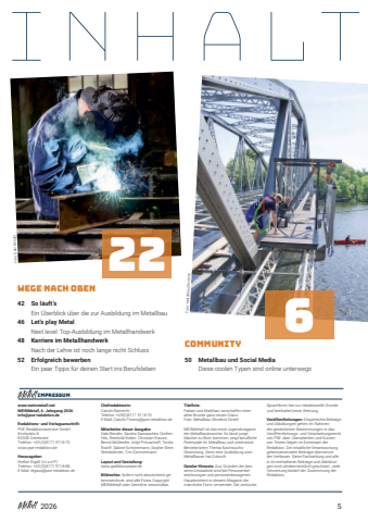 20265Community50 Metallbau und Social MediaDiese coolen Typen sind online unterwegs6Inhaltwww.meinmetall.netMEINMetall, 6. Jahrgang 2026info@pse-redaktion.deRedaktions- und Verlagsanschrift:PSE Redaktionsservice GmbHKirchplatz 882538 GeretsriedTelefon: +49 (0)8171 9118-70www.pse-redaktion.deHerausgeber: Stefan Elga%u00df (V.i.s.d.P.)Telefon: +49 (0)8171 9118-88E-Mail: elgass@pse-redaktion.deChefredakteurin:Carolin RamerthTelefon: +49(0)8171 9118-70E-Mail: Carolin.Thoma@pse-redaktion.deMitarbeiter dieser Ausgabe:Gabi Bender, Sandra Damaschke, DietherHils, Reinhold Kober, Christian Krause,Bernd M%u00fcllender, Antje Preuschoff, TordisRoloff, Sabine Sch%u00f6nemann, Sophie SternSteinb%u00f6hmer, Tim ZimmermannLayout und Gestaltung: www.grafikkonzepte.de Bildrechte: Sofern nicht abweichend gekennzeichnet, sind alle Fotos CopyrightMEINMetall oder lizenzfrei verwendbar.Titelfoto: Fabian und Matthias verschaffen eineralten Br%u00fccke ganz neuen Glanz. Foto: Metallbau Windeck GmbH MEINMetall ist das erste Jugendmagazinder Metallbaubranche. Es l%u00e4sst junge Macher zu Wort kommen, zeigt beruflichePotenziale im Metallbau und unterst%u00fctztBetriebe beim Thema NachwuchsGewinnung. Denn eine Ausbildung zumMetallbauer hat Zukunft.Gender-Hinweis: Aus Gr%u00fcnden der besseren Lesbarkeit wird bei Personenbezeichnungen und personenbezogenenHauptw%u00f6rtern in diesem Magazin diem%u00e4nnliche Form verwendet. Die verk%u00fcrzteSprachform hat nur redaktionelle Gr%u00fcndeund beinhaltet keine Wertung.Ver%u00f6ffentlichungen: Eingereichte Beitr%u00e4geund Abbildungen gehen im Rahmen der gesetzlichen Bestimmungen in dasVer%u00f6ffentlichungs- und Verarbeitungsrechtvon PSE %u00fcber. %u00dcberarbeiten und K%u00fcrzenvon Texten liegen im Ermessen der Redaktion. Die inhaltliche Verantwortunggekenn zeichneter Beitr%u00e4ge %u00fcbernimmt der Verfasser. Diese Fachzeitung und allein ihr ent halte nen Beitr%u00e4ge und Abbildungen sind urheberrechtlich gesch%u00fctzt. JedeVerwertung bedarf der Zustimmung derRedaktion.ImpressumWege nach oben42 So l%u00e4uft%u2019sEin %u00dcberblick %u00fcber die zur Ausbildung im Metallbau46 Let%u2019s play MetalNext level: Top-Ausbildung im Metallhandwerk 48 Karriere im MetallhandwerkNach der Lehre ist noch lange nicht Schluss52 Erfolgreich bewerbenEin paar Tipps f%u00fcr deinen Start ins BerufslebenFoto: Gabi Bender22Foto: Metallbau Windeck