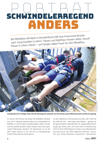 62026Im Januar 2024 lernten die beiden bei Metallbau Windeckaus. Die 21-J%u00e4hrigen arbeiten seither als Jung-Gesellen imStahlbau. In ihrem letzten Ausbildungsjahr sollen sie abernoch ein wirklich gro%u00dfes Projekt meistern, das ihnen spannende Erfahrungen beschert. Sie bekommen es mit der Alten Plauer Br%u00fccke zu tun, die sich im BrandenburgerOrtsteil Plaue %u00fcber die Havel spannt. An dem st%u00e4hlernen Schmuckst%u00fcck aus dem Jahr 1904 hatder Zahn der Zeit %u2013 oder besser das Wasser %u2013 genagt. Die60 geschmiedeten Gel%u00e4nderteile mit Jugendstilelemententaugen gar nichts mehr, erst recht nicht zur Absicherung.Einst mit ihren 400 Kilogramm massiv und widerstandsf%u00e4hig, sind sie nun vom Rost regelrecht zerfressen. %u201eDa lassen sich richtig Br%u00f6ckchen rausnehmen%u201c, demonstriertBei Metallbau Windeck in Brandenburg h%u00e4lt eine historische Br%u00fccke zwei Jung-Gesellen in Atem. Fabian und Matthias merken dabei, wievielNeues in Altem steckt %u2013 und fangen dabei Feuer f%u00fcr den Metallbau. **********************************************************************************************************************************************************************************************************SchwindelerregendPORTRATandersAufregende Zeit in luftiger H%u00f6he: Bei der Montage der Gel%u00e4nder auf der Br%u00fccke waren Millimeterarbeit und Nerven gefragtFoto: Metallbau Windeck
