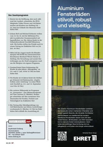 03|25Das Zusatzprogramm %u2022Bereits bei der Er%u00f6ffnung, aber auch w%u00e4hrend der Laufzeit, schmieden die IFGSMitglieder Volker Priewe und Adi Radermacher mit Kindern aus Stolberg (18. %u2013 22. Juni) im Gel%u00e4nde des Museums Zinkh%u00fctter Hof.%u2022Johann Reif und Michael Ertlmeier stellen vom 14. bis 16. Juli ihr M%u00fclleimer-Projekt in praktischer Zusammenarbeit mit Jugendlichen vor. Die Aktion findet in der Schmiedewerkstatt Zweifall/M%u00fcnsterau statt. Die beiden stellen das Projekt auch in einem Vortrag im Zinkh%u00fctter Hof vor (16. Juli, 18 Uhr).%u2022 Mitte Juli bis August macht die Wanderskulptur NO HATE des %u00f6sterreichischen Eisenbarons Bernhard Witsch Station in Stolberg. Die Verwaltung und soziale Einrichtungen aus der Stadt arrangieren rund um die Skulptur ein eigenes Programm.%u2022 Zweimal bietet Petra Gr%u00fcttemeiner f%u00fcrKinder ab zehn Jahren %u201eM%u00fcnzgie%u00dfen%u201c an. (12. und 17. Juli, 10 bis 12 Uhr) im Zinkh%u00fctter Hof.%u2022F%u00fcr Kinder ab 14 Jahren bietet der Stolberger Schmied Adi Radermacher %u201eKupfertreiben unter Anleitung%u201c in seiner Werkstatt Zweifall an. (13. und 14. September von 9 bis 16 Uhr).%u2022 Ein weiterer H%u00f6hepunkt im Programm ist %u201eGrenzenlos%u201c, eine Mitmachwerkstatt mit Tom Carstens (3. Oktober). Stolberger schmieden mit ihm zusammen Friedenstauben f%u00fcr Frieden, Freiheit und Vielseitigkeit im Zinkh%u00fctter Hof. %u2022Ein Vortrag %u00fcber Metallgestaltung von Adi Radermacher am letzten Ausstellungswochenende (5. Oktober, 15 Uhr) im Zinkh%u00fctter Hof schlie%u00dft die Ausstellung ab. KONTAKTKupferstadt StolbergTourismusb%u00fcroZweifaller Stra%u00dfe 5, 52222 Stolberg/RheinlandTel.: +49 (0)2402 13456www.stolberg.de Aluminium Fensterl%u00e4den stilvoll, robust und vielseitig. Mit unseren Aluminium-Fensterl%u00e4den verleihen Sie Geb%u00e4uden einen markanten Charakter und setzen gezielt Akzente, die mit jeder Architektur harmonisieren von traditionell bis modern. S%u00e4mtliche Fensterl%u00e4den lassen sich mit %u00fcber 4.000 Farben, 80 Modellen und 400 Varianten bis ins kleinste Detail individualisieren. Dank widerstandsf%u00e4higer Beschichtung sind sie pflegeleicht und bieten eine lange Lebensdauer.