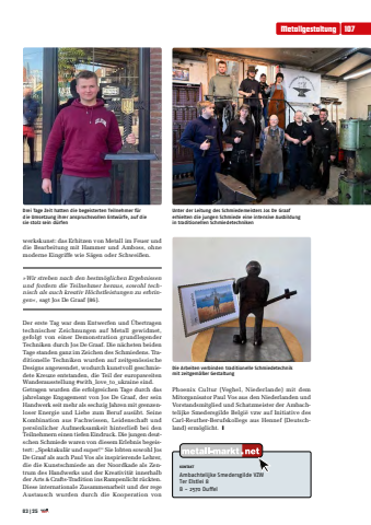 Metallgestaltung10703|25werkskunst: das Erhitzen von Metall im Feuer und die Bearbeitung mit Hammer und Amboss, ohne moderne Eingriffe wie S%u00e4gen oder Schwei%u00dfen. %u00bbWir streben nach den bestm%u00f6glichen Ergebnissen und fordern die Teilnehmer heraus, sowohl technisch als auch kreativ H%u00f6chstleistungen zu erbringen%u00ab, sagt Jos De Graaf (86).Der erste Tag war dem Entwerfen und %u00dcbertragen technischer Zeichnungen auf Metall gewidmet, gefolgt von einer Demonstration grundlegender Techniken durch Jos De Graaf. Die n%u00e4chsten beiden Tage standen ganz im Zeichen des Schmiedens. Traditionelle Techniken wurden auf zeitgen%u00f6ssische Designs angewendet, wodurch kunstvoll geschmiedete Kreuze entstanden, die Teil der europaweiten Wanderausstellung #with_love_to_ukraine sind.Getragen wurden die erfolgreichen Tage durch das jahrelange Engagement von Jos De Graaf, der sein Handwerk seit mehr als sechzig Jahren mit grenzenloser Energie und Liebe zum Beruf aus%u00fcbt. Seine Kombination aus Fachwissen, Leidenschaft und pers%u00f6nlicher Aufmerksamkeit hinterlie%u00df bei den Teilnehmern einen tiefen Eindruck. Die jungen deutschen Schmiede waren von diesem Erlebnis begeistert: %u201eSpektakul%u00e4r und super!%u201c Sie lobten sowohl Jos De Graaf als auch Paul Vos als inspirierende Lehrer, die die Kunstschmiede an der Noordkade als Zentrum des Handwerks und der Kreativit%u00e4t innerhalb der Arts & Crafts-Tradition ins Rampenlicht r%u00fcckten.Diese internationale Zusammenarbeit und der rege Austausch wurden durch die Kooperation von KONTAKTAmbachtelijke Smedersgilde VZWTer Elstlei 8B - 2570 DuffelUnter der Leitung des Schmiedemeisters Jos De Graaf erhielten die jungen Schmiede eine intensive Ausbildung in traditionellen SchmiedetechnikenPhoenix Cultur (Veghel, Niederlande) mit dem Mitorganisator Paul Vos aus den Niederlanden und Vorstandsmitglied und Schatzmeister der Ambachtelijke Smedersgilde Belgi%u00eb vzw auf Initiative des Carl-Reuther-Berufskollegs aus Hennef (Deutschland) erm%u00f6glicht. yDrei Tage Zeit hatten die begeisterten Teilnehmer f%u00fcr die Umsetzung ihrer anspruchsvollen Entw%u00fcrfe, auf die sie stolz sein d%u00fcrfenDie Arbeiten verbinden traditionelle Schmiedetechnik mit zeitgem%u00e4%u00dfer Gestaltung