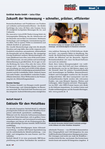 Gottlieb Nestle GmbH %u2013 Leica iCS50Zukunft der Vermessung %u2013 schneller, pr%u00e4ziser, effizienterBestandsaufnahmen und Projektionen von Punkten auf vertikalen und horizontalen Ebenen %u2013 der direkte Nachfolger des Leica 3D Disto oder Geomax Zoom 3D erm%u00f6glicht hochpr%u00e4zise Messungen f%u00fcr An- und Umbauten.Die innovative Leica-iCON-Trades-L%u00f6sung bietet ein leistungsstarkes Werkzeug, das die Arbeitsweise auf der Baustelle und im B%u00fcro revolutioniert. Modernste Technologie und intelligente Automatisierung helfen dabei, Zeit zu sparen, Fehler zu minimieren und Abl%u00e4ufe deutlich zu optimieren.Die visuelle Messtechnologie zeigt stets die aktuelle Situation und sorgt daf%u00fcr, dass nichts vergessen wird. Zus%u00e4tzlich reduzieren automatisierte Arbeitsabl%u00e4ufe die Komplexit%u00e4t auf ein Minimum. Die einzigartige L%u00f6sung kombiniert mehrere Messtechnologien wie Laser, kabellosen Leica vPen, Leica vPole sowie Linienoder Fl%u00e4chenscans, um eine pr%u00e4zise und zuverl%u00e4ssige Datenerfassung zu gew%u00e4hrleisten. Es ist egal, in welche Richtung der Leica vPen oder der Leica vPole bewegt wird %u2013 ihr einzigartiges Muster wird jederzeit zuverl%u00e4ssig von dem Leica iCON iCS50 erkannt. Zus%u00e4tzlich wird die Lotstabneigung automatisch kompensiert und die Lotstabh%u00f6he erfasst. Dadurch lassen sich mehr Punkte, einschlie%u00dflich verdeckter Punkte, effizient abstecken. Diese Weltneuheit in der Vermessung hat ein Alleinstellungsmerkmal.Geomax Zoom45Die Geomax Zoom45 von Hexagon wurde speziell f%u00fcr Vermessungs- und Absteckaufgaben im Bauwesen entwickelt. Ihr F%u00fcnf-Zoll-Farb-Touchscreen und das integrierte Android-Betriebssystem erm%u00f6glichen eine nahtlose Nutzung der X-PAD-Software direkt am Ger%u00e4t %u2013 ein separates Tablet ist %u00fcberfl%u00fcssig. Das macht die Bedienung besonders komfortabel und erh%u00f6ht die Effizienz auf der Baustelle. Digitale Bestandsaufnahme mit einer On-Board-Software war noch nie einfacher.Dank ihrer hohen Messgenauigkeit von wahlweise zwei oder f%u00fcnf Zoll und einer reflektorlosen Reichweite von bis zu 500 Metern eignet sich die Zoom45 ideal f%u00fcr pr%u00e4zise Fassadenaufma%u00dfe und Anwendungen im Stahlbau. Benutzerfreundlichkeit und Genauigkeit werden bei der Zoom45 gro%u00dfgeschrieben: Mit dem Laserpointer und der hochaufl%u00f6senden Optik werden alle relevanten Punkte, wie zum Beispiel Sparren, Pfetten und Leibungen, dabei bequem anvisiert. Planungsdaten im DXF- oder DWG-Format lassen sich direkt in die Software importieren. So werden Linien und Punkte millimetergenau auf die Fassade %u00fcbertragen.Info: www.g-nestle.de yDie Geomax Zoom45 von Hexagon wurde speziell f%u00fcr Vermessungs- und Absteckaufgaben im Bauwesen entwickeltNetSoft Metall XExklusiv f%u00fcr den MetallbauDie aktuelle Generation NetSoft Metall X verbindet praxisgerechte Software mit echter Metallbau-Kompetenz: individuell, spezialisiert, unabh%u00e4ngig.W%u00e4hrend sich f%u00fcr deutsche Softwareunternehmen aktuell der Trend abzeichnet, sich in gr%u00f6%u00dfere Unternehmensstrukturen und Investmentverwaltungen einzuf%u00fcgen und daraus oft ein Flickenteppich ehemals eigenst%u00e4ndiger Systeme entsteht, bleibt NetSoft unabh%u00e4ngig.Unser Weg: keine Beteiligungen, keine AllroundAusrichtung %u2013 sondern 100 Prozent Spezialisierung auf die mittelst%u00e4ndische Metallverarbeitung %u2013 vom Stahl- und Anlagenbau bis zum Fenster- und Fassadenbau.NetSoft Metall X ist eine praxisnahe ERP-Komplettl%u00f6sung mit tiefem Verst%u00e4ndnis f%u00fcr metallverarbeitende Prozesse %u2013 von EN1090-Dokumentation %u00fcber Chargenpflicht und CAD-Integration bis zum GoBD-konformen Dokumenten-Managementsystem.Die L%u00f6sungen sind nicht nur stark im Workflow %u2013 sondern bereit f%u00fcr das, was kommt. Das System kann bereits heute mit smarter KI-Integration umgehen. yDie aktuelle Generation NetSoft Metall X verbindet praxisgerechte Software mit echter Metallbau-KompetenzFoto: netsoftAktuell1103|25
