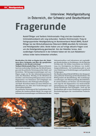 Faszinierendes HandwerkTeofanis Polichroniadis-Fleig114Metallgestaltung03|25Intervie Metallgestaltung in %u00d6sterreich, der Schweiz und DeutschlandFragerundeRudolf %u00d6hliger und Teofanis Polichroniadis-Fleig sind den Gestaltern im Schmiedehandwerk sehr eng verbunden. Teofanis Polichroniadis-Fleig ist Fachgruppenleiter Metallgestaltung im Bundesverband Metall (BVM), Rudolf %u00d6hliger bei der Wirtschaftskammer %u00d6sterreich (WKO) ebenfalls f%u00fcr Schmiede und Metallgestalter aktiv. Beide haben uns auf einige aktuelle Fragen rund um die Metallgestaltung geantwortet. Von der Metalltec Suisse, dem zust%u00e4ndigen Fachverband in der Schweiz haben wir bis zum Redaktionsschluss leider keine Antworten erhalten.Beschreiben Sie bitte zu Beginn kurz die Strukturen ihres Verbandes und Ihre die spezifischen Aufgaben in der Berufsvertretung?Teofanis Polichroniadis-Fleig: Wir haben in Deutschland eine mehrstufige Gliederung. Die Metall-Innungen sind die politische Vertretung auf der Stadt- und Kreisebene. Mit Innungsversammlungen und -ausfl%u00fcgen sorgen sie f%u00fcr den Informationsaustausch unter den Betrieben. Wichtig ist die Mitarbeit im Gesellen- und Zwischenpr%u00fcfungsausschuss und die Organisation von Seminaren und Lehrg%u00e4ngen wie Ersthelfer-Kursen oder Pr%u00fcfungsvorbereitungen.Auf Stadt- Kreisebene haben wir einen Verbund von Metallbauern aus allen drei Fachrichtungen und Feinwerkmechanikern. Die politische Vertretung auf der Landesebene %u00fcbernehmen die Landesverb%u00e4nde Metall. Sie sorgen mit Informationsveranstaltungen und Referenten f%u00fcr den Informationsfluss und informieren mit regelm%u00e4%u00dfigen Rundschreiben zu Fachthemen, die f%u00fcr Betriebe wichtig sind. Sie bilden Aussch%u00fcsse zur Schlichtung von Streitigkeiten im Rahmen von Ausbildungsverh%u00e4ltnissen. Auf Landesebene gibt es auch eine Gliederung in Fachrichtungen und spezifische Fachgruppen. Der Bundesverband Metall (BVM) ist die %u00fcbergeordnete politische Vertretung auf der Bundesebene. Der BVM gestaltet die Berufsbildung. Mit Ausbildungsverordnungen und Meisterpr%u00fcfungs-Berufsbildern. Er nimmt Einfluss auf Normen und Verordnungen und sorgt f%u00fcr die Organisation von Sachverst%u00e4ndigenseminaren und -pr%u00fcfungen und erarbeitet technische Richtlinien und Fachregeln. Auch auf der Bundesebene gibt es eine Gliederung in spezifische Bundesfachgruppen der verschiedenen Fachrichtungen.Foto: Thilo Ro%u00df