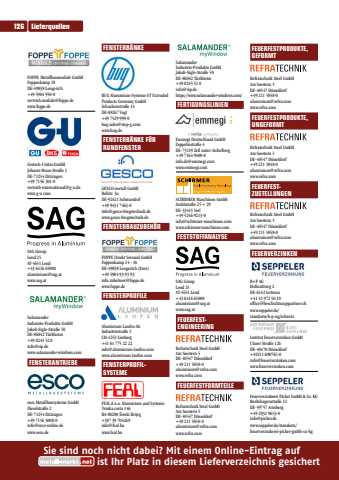 Sie sind noch nicht dabei? Mit einem Online-Eintrag aufist Ihr Platz in diesem Lieferverzeichnis gesichertFOPPE Metallbaumodule GmbHFoppenkamp 18DE-49838 Lengerich+49 5904 950-0vertrieb.module@foppe.dewww.foppe.deGretsch-Unitas GmbHJohann-Maus-Stra%u00dfe 3DE-71254 Ditzingen+49 7156 301-0vertrieb-international@g-u.dewww.g-u.comSAG GroupLend 25AT-5651 Lend+43 6416 65000aluminium@sag.atwww.sag.atSalamander Industrie-Produkte GmbHJakob-Sigle-Stra%u00dfe 58DE-86842 T%u00fcrkheim+49 8245 52 0info@sip.dewww.salamander-windows.comFENSTERANTRIEBEesco Metallbausysteme GmbHDieselstra%u00dfe 2DE-71254 Ditzingen+49 7156 3008-0info@esco-online.dewww.esco.deFENSTERB%u00c4NKEBUG Aluminium-Systeme ST Extruded Products Germany GmbHSchachenstra%u00dfe 14DE-88267 Vogt+49 7529 999-0bug.sales@step-g.comwww.bug.deFENSTERB%u00c4NKE F%u00dcR RUNDFENSTERGESCO-metall GmbHBellstr. 3aDE-92421 Schwandorf+49 9431 7463-0info@gesco-biegetechnik.dewww.gesco-biegetechnik.deFENSTERBAUZUBEH%u00d6RFOPPE Direkt Versand GmbHFoppenkamp 14 - 16DE-49838 Lengerich (Ems)+49 5904 93 93 93info.zubehoer@foppe.dewww.foppe.deFENSTERPROFILEAluminium Laufen AGIndustriestra%u00dfe 5CH-4253 Liesberg+41 61 775 22 22info@aluminium-laufen.comwww.aluminium-laufen.comFENSTERPROFILSYSTEMEFEAL d.o.o. Aluminium and SystemsTrnska cesta 146BA-88200 %u0160iroki Brijeg+387 39 704269info@feal.bawww.feal.baSalamander Industrie-Produkte GmbHJakob-Sigle-Stra%u00dfe 58DE-86842 T%u00fcrkheim+49 8245 52 0info@sip.dehttps://www.salamander-windows.com/FERTIGUNGSLINIENEmmegi Deutschland GmbHZeppelinstra%u00dfe 4DE-73119 Zell unter Aichelberg+49 7164 9400-0info.de@emmegi.comwww.emmegi.comSCHIRMER Maschinen GmbHStahlstra%u00dfe 25 + 29DE-33415 Verl+49 5246 9213-0info@schirmer-maschinen.comwww.schirmer-maschinen.comFESTSTOFFANALYSESAG GroupLend 25AT-5651 Lend+43 6416 65000aluminium@sag.atwww.sag.atFEUERFESTENGINEERINGRefratechnik Steel GmbHAm Seestern 5DE-40547 D%u00fcsseldorf+49 211 5858-0aluminium@refra.comwww.refra.comFEUERFESTFORMTEILERefratechnik Steel GmbHAm Seestern 5DE-40547 D%u00fcsseldorf+49 211 5858-0aluminium@refra.com www.refra.comFEUERFESTPRODUKTE, GEFORMTRefratechnik Steel GmbHAm Seestern 5DE-40547 D%u00fcsseldorf+49 211 5858-0aluminium@refra.comwww.refra.comFEUERFESTPRODUKTE, UNGEFORMTRefratechnik Steel GmbHAm Seestern 5DE-40547 D%u00fcsseldorf+49 211 5858-0aluminium@refra.comwww.refra.comFEUERFESTZUSTELLUNGENRefratechnik Steel GmbHAm Seestern 5DE-40547 D%u00fcsseldorf+49 211 5858-0aluminium@refra.comwww.refra.comFEUERVERZINKENB+P AGHofmattweg 2DE-6142 Gettnau+41 41 972 50 10office@beschichtungspartner.chwww.seppeler.de/ standorte/b-p-ag/schweizInstitut Feuerverzinken GmbHUlmer Stra%u00dfe 126DE-40470 D%u00fcsseldorf+49211 690765-0info@feuerverzinken.comwww.feuerverzinken.comFeuerverzinkerei Picker GmbH & Co. KGBorkshagenstra%u00dfe 12DE-59757 Arnsberg+49 2932 9653-0info@picker.dewww.seppeler.de/standorte/ feuerverzinkerei-picker-gmbh-co-kg126Lieferquellen