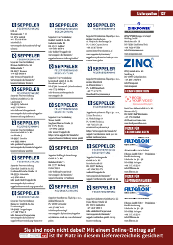 Sie sind noch nicht dabei? Mit einem Online-Eintrag aufist Ihr Platz in diesem Lieferverzeichnis gesichertSie sind noch nicht dabei? Mit einem Online-Eintrag aufist Ihr Platz in diesem Lieferverzeichnis gesichertSDL AGBeundenrain 7-13CH-4932 Lotzwil+41 62 919 46 00info@sdl.chwww.seppeler.de/standorte/sdl-ag/schweizSeppeler Feuerverzinkung Bremen GmbH & Co. KGH%u00fcttenstra%u00dfe 7DE-28237 Bremen+49 421 69448-8info-bremen@seppeler.dewww.seppeler.de/standorte/ feuerverzinkung-bremenSeppeler Feuerverzinkung Delbr%u00fcck GmbH & Co. KGLindenweg 6DE-33129 Delbr%u00fcck+495258 5000-0info-delbrueck@seppeler.dewww.seppeler.de/standorte/seppelerfeuerverzinkung-delbrueckSeppeler Feuerverzinkung Genthin GmbH & Co. KGAm Werder 3DE-39307 Genthin+49 3933 8899-0info-genthin@seppeler.dewww.seppeler.de/standorte/seppelerfeuerverzinkung-genthinSeppeler Feuerverzinkung G%u00fctersloh GmbH & Co. KGFerdinand-Porsche-Stra%u00dfe 10DE-33334 G%u00fctersloh+49 5241 604-0info-guetersloh@seppeler.dewww.seppeler.de/standorte/ seppeler-feuerverzinkung-gueterslohSeppeler Feuerverzinkung Hannover GmbH & Co. KGFrankenring 41DE-30855 Langenhagen+49 511 97865-0info-hannover@seppeler.dewww.seppeler.de/standorte/ seppeler-feuerverzinkung-hannoverSeppeler Feuerverzinkung Holdorf GmbH & Co. KGIndustriestra%u00dfe 28DE-49451 Holdorf+49 5494 9878-0info-holdorf@seppeler.dewww.seppeler.de/standorte/ seppeler-feuerverzinkung-holdorfSeppeler Feuerverzinkung Lennestadt GmbH & Co. KGHundemstra%u00dfe 136DE-57368 Lennestadt (Altenhundem)+49 2723 68643-0info-lennestadt@seppeler.dewww.seppeler.deSeppeler Feuerverzinkung Waren GmbHSiegfried-Marcus-Stra%u00dfe 35DE-17192 Waren+49 3991 611560info-waren@seppeler.dehttps://www.seppeler.de/standorte/ seppeler-feuerverzinkung-waren-gmbhSeppeler Holding & Verwaltungs GmbH & Co. KGBahnhofstra%u00dfe 55DE-33397 Rietberg05244 983-0info-holding@seppeler.dewww.seppeler.de/standorte/ seppeler-holding-verwaltungSeppeler Ocynkownia %u015al%u0105sk Sp. z o.o., Zak%u0142ad Chrzan%u00f3wPL-32500 Chrzan%u00f3w+48 32 649 70 00info@ocynkownia.plwww.seppeler.de/standorte/seppelerocynkownia-slask-sp-z-oo-chrzanow/polenSeppeler Ocynkownia %u015al%u0105sk Sp. z o.o., Zak%u0142ad Cz%u0119stochowaul. Wojciecha Korfantego 29PL-42202 Cz%u0119stochowa+48 34 367 60 00czestochowa@ocynkownia.plwww.seppeler.de/standorte/ seppeler-ocynkownia-slask-sp-z-ooczestochowa/polenSeppeler Ocynkownia %u015al%u0105sk Sp. z o.o., Zak%u0142ad Kluczborkul. Przemys%u0142owa 4PL-46200 Kluczbork+48 77 417 1771kluczbork@ocynkownia.plSeppeler Ocynkownia %u015al%u0105sk Sp. z o.o., Zak%u0142ad %u015awidnicaul. Wokulskiego 14PL-58100 %u015awidnica+48 74 633 54 18swidnica@ocynkownia.plhttps://www.seppeler.de/standorte/seppeler-ocynkownia-slask-sp-z-oozaklad-swidnica/polenSeppeler Rietbergwerke GmbH & Co. KGBahnhofstra%u00dfe 55DE-33397 Rietberg+49 5244 983-275verkauf@seppeler.dewww.seppeler.de/standorte/ seppeler-rietbergwerke-gmbh-co-kgSeppeler Salzkotten GmbH & Co. KGFranz-Kleine-Stra%u00dfe 26DE-33154 Salzkotten+49 5258 5000-0info-salzkotten@seppeler.dewww.seppeler.de/standorte/ seppeler-salzkotten-gmbh-co-kgfeuerverzinkungZINKPOWER Gruppe c/o Kopf Holding GmbHHeinkelstra%u00dfe 25DE-73230 Kirchheim/Teck+49 7021 975560info@zinkpower.comwww.zinkpower.comZINQ GmbH & Co. KGNordring 4DE-45894 Gelsenkirchen+49 209 319270-0info@zinq.comwww.zinq.comFILMPRODUKTIONBook Your Video GmbH & Co. KGHeimstra%u00dfe 23DE-86825 Bad W%u00f6rishofen+49 170 2040262rk@bookyourvideo.comwww.bookyourvideo.comFILTER F%u00dcR LACKIERANLAGENFilteron GmbH Filter %u2013 Produktion %u2013 KonfektionierungL%u00f6hdorfer Str. 30 - 36DE-42699 Solingen+49 212 262 33-0info@filteron.dewww.filteron.deFILTER F%u00dcR L%u00dcFTUNGSANLAGENFilteron GmbH Filter %u2013 Produktion %u2013 KonfektionierungL%u00f6hdorfer Str. 30 - 36DE-42699 Solingen+49 212 262 33-0info@filteron.dewww.filteron.deLieferquellen127