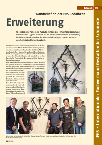 Das Projekt wurde vor mehreren Jahren von IFGS-Pr%u00e4sident Thomas-Maria Schmidt ins Leben gerufen, um eines der %u00e4ltesten Handwerke der Menschheit %u2013 das Schmieden %u2013 jungen Menschen n%u00e4herzubringen. Dank des Engagements von Thomas-Maria Schmidt wurde das Schmiedehandwerk inzwischen in das bayerische Verzeichnis des Immateriellen Kulturerbes aufgenommen.Das Wandrelief ist %u00fcber die Jahre zu einem Symbol f%u00fcr gelebte Tradition und kreative Nachwuchsf%u00f6rderung geworden. Besonders erfreulich: An diesem Gemeinschaftswerk haben bereits ein Bundessieger im Schmiedehandwerk und ein weiterer Sch%u00fcler der BBS Rodalben mitgewirkt, der sich f%u00fcr die Deutsche Meisterschaft qualifiziert hat.Das Projekt zeigt eindrucksvoll, wie ein traditionsreiches Handwerk durch engagierte Projekte lebendig bleibt undjunge Talente begeistert. yIFGS - Internationaler Fachverband Gestaltender Schmiedev.l.n.r.: der stellvertretende Schulleiter Thomas Taciak, Thomas-Maria Schmidt, Robin Muth, Leo Heintze und der Fachlehrer Stefan SommerFotos: IFGS03|25129Wandrelief an der BBS Rodalbene ErweiterungWie jedes Jahr haben die Auszubildenden der Firma Metallgestaltung Schmidt zum Tag der offenen T%u00fcr an der Berufsbildenden Schule (BBS) Rodalben das eindrucksvolle Wandrelief im Foyer um ein weiteres geschmiedetes Element erg%u00e4nzt.Netzwerk