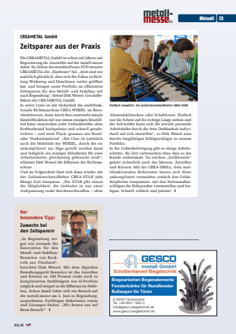 CREAMETAL GmbH Zeitsparer aus der PraxisDie CREAMETAL GmbH ist schon seit Jahren mit Begeisterung als Aussteller auf der metall-messe dabei. Zu Zeiten der metallsoftware S%u00dcD steuerte CREAMETAL die %u201eHardware%u201c bei. %u201eJetzt sind wir nat%u00fcrlich gl%u00fccklich, dass sich der Fokus in Richtung Werkzeug und Maschinen weiter ge%u00f6ffnet hat, und bringen unser Portfolio an effizienten Zeitsparern f%u00fcr den Metall- und Stahlbau mit nach Regensburg%u201c, betont Dirk Weisel, Gesch%u00e4ftsf%u00fchrer der CREAMETAL GmbH. In erster Linie ist mit Sicherheit die multifunktionale Richtmaschine CREA-WHEEL im Besucherinteresse, denn durch ihre unerreicht simple Einstellfunktion mit nur einem einzigen Einstellrad kann inzwischen jeder Gel%u00e4nderst%u00e4be ohne Kraftaufwand hochpr%u00e4zise und schnell geraderichten %u2013 und zwar Flach- genauso wie Rundoder Vierkantmaterial. %u201eDer Clou ist nat%u00fcrlich auch die Mobilit%u00e4t der WHEEL, durch die sie unkompliziert zur S%u00e4ge gerollt werden kann und lediglich ein einziger Mitarbeiter f%u00fcr zwei Arbeitsschritte gleichzeitig gebraucht wird%u201c, erl%u00e4utert Dirk Weisel die Effizienz der Richtmaschine. Und im Folgeschritt l%u00e4sst sich dann wieder mit der Gel%u00e4nderschwei%u00dflehre CREA-STAR jede Menge Zeit einsparen. %u201eDie STAR gibt einem die M%u00f6glichkeit, die Gel%u00e4nder in nur einer Aufspannung exakt durchzuschwei%u00dfen %u2013 ohne Abstandskl%u00f6tzchen oder Schablonen. Einfach nur die Schere auf die richtige L%u00e4nge ziehen und der Schwei%u00dfer kann sich die jeweils passende Arbeitsh%u00f6he durch die freie Drehbarkeit individuell auf sich einstellen%u201c, so Dirk Weisel zum bereits langj%u00e4hrigen Erfolgsschlager in seinem Portfolio. In der Gel%u00e4nderfertigung gibt es einige Arbeitsschritte, die Zeit verbrauchen ohne dass es der Kunde wahrnimmt. Zu solchen %u201eZeitfressern%u201c geh%u00f6rt sicherlich auch das Messen, Anrei%u00dfen und K%u00f6rnen. Mit der CREA-DRILL, dem multifunktionalen Bohrcenter lassen sich diese unkompliziert vermeiden: einfach den Gel%u00e4nderpfosten einspannen, mit den Serienma%u00dfanschl%u00e4gen die Bohrpunkte voreinstellen und loslegen. Schnell, einfach und pr%u00e4zise! yVielfach bew%u00e4hrt: die Gel%u00e4nderschwei%u00dflehre CREA-STARDer besondere Tipp:Zuwachs bei den Zeitsparern%u201eIn Regensburg zeigen wir erstmals die Innovation f%u00fcr den Metall- und Stahlbau: BeamAce von Rockroth aus Finnland%u201c, berichtet Dirk Weisel. Mit dem digitalen Bema%u00dfungsger%u00e4t BeamAce ist das Anrei%u00dfen und K%u00f6rnen zu 100 Prozent exakt auch in komplizierten Stahltr%u00e4gern wie H-Profilen m%u00f6glich und steigert so die Effizienz im Stahlbau. Schon damit lohnt sich ein Besuch auf der metall-messe am 5. Juni in Regensburg: ausprobieren, Fachfragen diskutieren, testen und L%u00f6sungen finden. %u201eWir freuen uns auf Ihren Besuch!%u201c yD-92421 SchwandorfTel. +49 9431 7463-0info@gesco-biegetechnik.de www.gesco-biegetechnik.deBiegearbeiten BogenelementeFensterb%u00e4nke f%u00fcr RundfensterBullaugen f%u00fcr T%u00fcrenAktuell1303|25