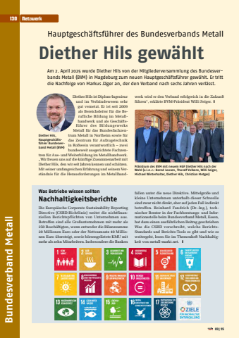 Diether Hils, Hauptgesch%u00e4ftsf%u00fchrer Bundesverband Metall (BVM)Pr%u00e4sidium des BVM mit neuem HGF Diether Hils nach der Wahl (v.l.n.r.: Bernd Loosen, Thoralf Volkens, Willi Seiger, Michael Winterhalter, Diether Hils, Christian Metges)Was Betriebe wissen sollten Nachhaltigkeitsberichte Die Europ%u00e4ische Corporate Sustainability Reporting Directive (CSRD-Richtlinie) weitet die nichtfinanziellen Berichtspflichten von Unternehmen aus. Betroffen sind alle Gro%u00dfunternehmen mit mehr als 250 Besch%u00e4ftigten, wenn entweder die Bilanzsumme 20 Millionen Euro oder der Nettoumsatz 40 Millionen Euro %u00fcbersteigt, sowie b%u00f6rsengelistete KMU mit mehr als zehn Mitarbeitern. Insbesondere die Banken fallen unter die neue Direktive. Mittelgro%u00dfe und kleine Unternehmen unterhalb dieser Schwelle sind zwar nicht direkt, aber auf jeden Fall indirekt betroffen. Reinhard Fandrich (Dr.-Ing.), technischer Berater in der Fachberatungs- und Informationsstelle beim Bundesverband Metall, Essen, hat dazu einen ausf%u00fchrlichen Beitrag geschriebenWas die CSRD vorschreibt, welche BerichtsStandards und Berichts-Tools es gibt und wie es weitergeht, lesen Sie im Themenheft Nachhaltigkeit von metall-markt.net. yBundesverband MetallHauptgesch%u00e4ftsf%u00fchrer des Bundesverbands MetallDiether Hils gew%u00e4hltAm 2. April 2025 wurde Diether Hils von der Mitgliederversammlung des Bundesverbands Metall (BVM) in Magdeburg zum neuen Hauptgesch%u00e4ftsf%u00fchrer gew%u00e4hlt. Er tritt die Nachfolge von Markus J%u00e4ger an, der den Verband nach sechs Jahren verl%u00e4sst.Diether Hils ist Diplom-Ingenieur und im Verb%u00e4ndewesen sehr gut vernetzt. Er ist seit 2009 als Bereichsleiter f%u00fcr die Berufliche Bildung im Metallhandwerk und als Gesch%u00e4ftsf%u00fchrer des Bildungswerks Metall f%u00fcr das Bundesfachzentrum Metall in Northeim sowie f%u00fcr das Zentrum f%u00fcr Aufzugstechnikin Ro%u00dfwein verantwortlich %u2013 zwei bundesweit ausgerichtete Fachzentren f%u00fcr Aus- und Weiterbildung im Metallhandwerk. %u201eWir freuen uns auf die k%u00fcnftige Zusammenarbeit mit Diether Hils, den wir seit Jahren kennen und sch%u00e4tzen. Mit seiner umfangreichen Erfahrung und seinem Verst%u00e4ndnis f%u00fcr die Herausforderungen im Metallhandwerk wird er den Verband erfolgreich in die Zukunft f%u00fchren%u201c, erkl%u00e4rte BVM-Pr%u00e4sident Willi Seiger. y03|25130Netzwerk