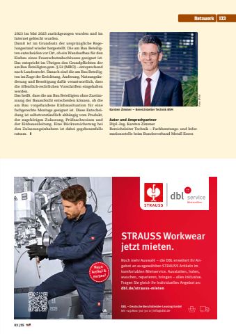 xxx2023 im Mai 2025 zur%u00fcckgezogen wurden und im Internet gel%u00f6scht wurden. Damit ist im Grundsatz der urspr%u00fcngliche Regelungsstand wieder hergestellt. Die am Bau Beteiligten entscheiden vor Ort, ob ein Wandaufbau f%u00fcr den Einbau eines Feuerschutzabschlusses geeignet ist. Das entspricht im %u00dcbrigen den Grundpflichten der am Bau Beteiligten gem. %u00a7 52 (MBO) %u2013 entsprechend nach Landesrecht. Danach sind die am Bau Beteiligten im Zuge der Errichtung, %u00c4nderung, Nutzungs%u00e4nderung und Beseitigung daf%u00fcr verantwortlich, dass die %u00f6ffentlich-rechtlichen Vorschriften eingehalten werden. Das hei%u00dft, dass die am Bau Beteiligten ohne Zustimmung der Bauaufsicht entscheiden k%u00f6nnen, ob die am Bau vorgefundene Einbausituation f%u00fcr eine fachgerechte Montage geeignet ist. Diese Entscheidung ist selbstverst%u00e4ndlich abh%u00e4ngig vom Produkt, der zugeh%u00f6rigen Zulassung, Pr%u00fcfnachweisen und der Einbauanleitung. Eine R%u00fcckversicherung bei den Zulassungsinhabern ist dabei gegebenenfalls ratsam. ySTRAUSS Workwear jetzt mieten.Noch mehr Auswahl %u2013 die DBL erweitert ihr Angebot an ausgew%u00e4hlten STRAUSS Artikeln im komfortablen Mietservice. Ausstatten, holen, waschen, reparieren, bringen %u2013 alles inklusive. Fragen Sie gleich Ihr individuelles Angebot an:dbl.de/strauss-mietenDBL %u2013 Deutsche Berufskleider-Leasing GmbHtel: +49 800 310 311 0 | info@dbl.deNeue Artikel & Farben!DBL_Az_metall-markt_0325_180x126_Strauss.indd 115.05.25 16:19Autor und AnsprechpartnerDipl.-Ing. Karsten Zimmer Bereichsleiter Technik %u2013 Fachberatungs- und Informationsstelle beim Bundesverband Metall EssenKarsten Zimmer %u2013 Bereichsleiter Technik BVMFoto: BVM03|25Netzwerk133