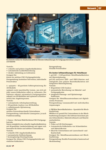 Vorteile:%u2022schnelle und pr%u00e4zise Angebotskalkulation%u2022automatische Laufzeitberechnung%u2022direkte Anbindung an LieferantenGeeignet f%u00fcr:kleine bis mittlere CNC-FertigungsbetriebePreisgestaltung: kostenlose Testversion, individuelle Preisstruktur2. up2parts %u2013 KI-gest%u00fctzte Selbstoptimierung f%u00fcr 3D-Modelleup2parts nutzt maschinelles Lernen, um sich mit jeder neuen Kalkulation selbst zu verbessern. Die Software erkennt automatisch Fertigungszeiten anhand von 3D-Modellen und optimiert so kontinuierlich den Angebotsprozess.Vorteile:%u2022automatische Arbeitsplanerstellung%u2022KI-gest%u00fctzte Analyse von 3D-Modellen%u2022selbstlernende OptimierungGeeignet f%u00fcr:mittlere Feinwerkmechanik-UnternehmenPreisgestaltung: individuelle Lizenzpreise, je nach Funktionsumfang3. Imnoo %u2013 Die beste Wahl f%u00fcr kleine CNC-FertigungsbetriebeImnoo erm%u00f6glicht eine schnelle Angebotskalkulation mit KI-gest%u00fctzter Laufzeitsch%u00e4tzung und eignet sich besonders f%u00fcr kleine und mittlere Unternehmen.Vorteile:%u2022 schnelle CNC-Angebotskalkulation%u2022 automatische Zeitberechnung%u2022 kosteng%u00fcnstige Einstiegsl%u00f6sungGeeignet f%u00fcr: kleine CNC-Fertigungsbetriebe mit einfacher KalkulationPreisgestaltung: Flexible PreisstrukturDie besten Softwarel%u00f6sungen f%u00fcr Metallbauer1.goCAD %u2013 CAD-gest%u00fctzte Metallbaukalkulation mit MaterialplanunggoCAD analysiert DXF- und DWG-Dateien und erm%u00f6glicht eine pr%u00e4zise Bauteilkalkulation mit integrierter Materialplanung.Vorteile:%u2022KI-gest%u00fctzte CAD-Analyse%u2022automatische Berechnung von Material- und Fertigungskosten%u2022integrierte Planungs- und OptimierungsfunktionenGeeignet f%u00fcr: Metallbauunternehmen mit digitalisierten ProzessenPreisgestaltung: Lizenzmodell mit individuellen Anpassungen2. PROfirst Bauteilkalkulation %u2013 Spezialist f%u00fcr BlechbearbeitungPROfirst ist speziell f%u00fcr Unternehmen in der Blechbearbeitung konzipiert. Die Software berechnet pr%u00e4zise Schneidzeiten, Materialverbrauch und Maschinenlaufzeiten.Vorteile:%u2022Fokus auf 2D-Zeichnungen%u2022Automatische Kalkulation von Schneidzeitenund Materialkosten%u2022Ideal f%u00fcr Unternehmen mit Laserschneid- undKanttechnikGeeignet f%u00fcr: Metallbauunternehmen mit BlechbearbeitungPreisgestaltung: flexible Preisstruktur basierend auf ModulumfangDas Deutsche Institut f%u00fcr Metalltechnik (DIM) hat f%u00fchrende Softwarel%u00f6sungen f%u00fcr Fertigungsunternehmen analysiert und bewertetFoto: AdobeStock_Maryna03|25Netzwerk137