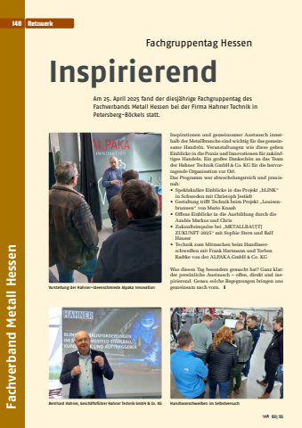 Fachverband Metall HessenFachgruppentag HessenInspirierendAm 25. April 2025 fand der diesj%u00e4hrige Fachgruppentag des Fachverbands Metall Hessen bei der Firma Hahner Technik in Petersberg-B%u00f6ckels statt.Inspirationen und gemeinsamer Austausch innerhalb der Metallbranche sind wichtig f%u00fcr das gemeinsame Handeln. Veranstaltungen wie diese geben Einblicke in die Praxis und Innovationen f%u00fcr zuk%u00fcnftiges Handeln. Ein gro%u00dfes Danksch%u00f6n an das Team der Hahner Technik GmbH & Co. KG f%u00fcr die hervorragende Organisation vor Ort. Das Programm war abwechslungsreich und praxisnah: %u2022Spektakul%u00e4re Einblicke in das Projekt %u201ebLINK%u201c in Schweden mit Christoph Jest%u00e4dt %u2022Gestaltung trifft Technik beim Projekt %u201eLouisenbrunnen%u201c von Mario Knaab %u2022Offene Einblicke in die Ausbildung durch die Azubis Markus und Chris %u2022Zukunftsimpulse bei %u201eMETALLBAU[T] ZUKUNFT 2025%u201c mit Sophie Stern und Ralf Hauser %u2022Technik zum Mitmachen beim Handlaserschwei%u00dfen mit Frank Hartmann und Torben Radtke von der ALPAKA GmbH & Co. KG Was diesen Tag besonders gemacht hat? Ganz klar: der pers%u00f6nliche Austausch %u2013 offen, direkt und inspirierend. Genau solche Begegnungen bringen uns Vorstellung der Hahner-Ideenschmiede Alpaka Innovationgemeinsam nach vorn. yBernhard Hahner, Gesch%u00e4ftsf%u00fchrer Hahner Technik GmbH & Co. KGHandlaserschwei%u00dfen im Selbstversuch03|25140Netzwerk