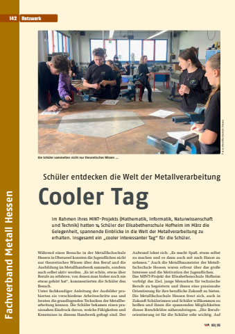 Fachverband Metall HessenSch%u00fcler entdecken die Welt der MetallverarbeitungCooler TagIm Rahmen ihres MINT-Projekts (Mathematik, Informatik, Naturwissenschaft und Technik) hatten 14 Sch%u00fcler der Elisabethenschule Hofheim im M%u00e4rz die Gelegenheit, spannende Einblicke in die Welt der Metallverarbeitung zu erhalten. Insgesamt ein %u201ecooler interessanter Tag%u201c f%u00fcr die Sch%u00fcler.W%u00e4hrend eines Besuchs in der Metallfachschule Hessen in Oberursel konnten die Jugendlichen nicht nur theoretisches Wissen %u00fcber den Beruf und die Ausbildung im Metallhandwerk sammeln, sondern auch selbst aktiv werden. %u201eEs ist sch%u00f6n, etwas %u00fcber Berufe zu erfahren, von denen man bisher noch nie etwas geh%u00f6rt hat%u201c, kommentierten die Sch%u00fcler den Besuch. Unter fachkundiger Anleitung der Ausbilder probierten sie verschiedene Arbeitsschritte aus und lernten die grundlegenden Techniken der Metallbearbeitung kennen. Die Sch%u00fcler bekamen einen praxisnahen Eindruck davon, welche F%u00e4higkeiten und Kenntnisse in diesem Handwerk gefragt sind. Der Aufwand lohnt sich: %u201eEs macht Spa%u00df, etwas selbst zu machen und es dann auch mit nach Hause zu nehmen.%u201d Auch die Metallbaumeister der Metallfachschule Hessen waren erfreut %u00fcber das gro%u00dfe Interesse und die Motivation der Jugendlichen. Das MINT-Projekt der Elisabethenschule Hofheim verfolgt das Ziel, junge Menschen f%u00fcr technische Berufe zu begeistern und ihnen eine praxisnahe Orientierung f%u00fcr ihre berufliche Zukunft zu bieten. Die Metallfachschule Hessen freut sich, auch in Zukunft Sch%u00fclerinnen und Sch%u00fcler willkommen zu hei%u00dfen und ihnen die spannenden M%u00f6glichkeiten dieses Berufsfeldes n%u00e4herzubringen. %u201eDie Berufsorientierung ist f%u00fcr die Sch%u00fcler sehr wichtig. Auf Fotos: Metallfachschule HessenDie Sch%u00fcler sammelten nicht nur theoretisches Wissen %u202603|25142Netzwerk