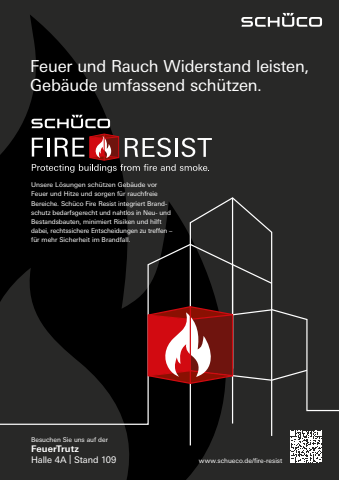 www.schueco.de/fire-resistUnsere L%u00f6sungen sch%u00fctzen Geb%u00e4ude vor Feuer und Hitze und sorgen f%u00fcr rauchfreie Bereiche. Sch%u00fcco Fire Resist integriert Brandschutz bedarfsgerecht und nahtlos in Neu- und Bestandsbauten, minimiert Risiken und hilft dabei, rechtssichere Entscheidungen zu treffen %u2013 f%u00fcr mehr Sicherheit im Brandfall.Besuchen Sie uns auf derFeuerTrutzHalle 4A | Stand 109Feuer und Rauch Widerstand leisten, Geb%u00e4ude umfassend sch%u00fctzen.