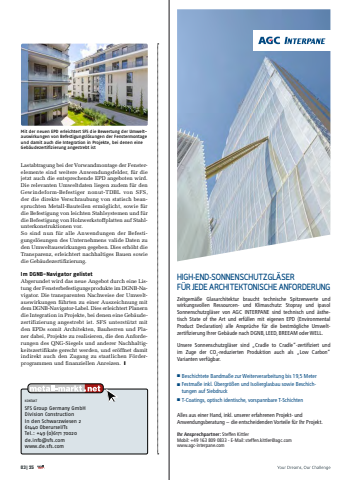 Lastabtragung bei der Vorwandmontage der Fensterelemente sind weitere Anwendungsfelder, f%u00fcr die jetzt auch die entsprechende EPD angeboten wird. Die relevanten Umweltdaten liegen zudem f%u00fcr den Gewindeform-Befestiger nonut-TDBL von SFS, der die direkte Verschraubung von statisch beanspruchten Metall-Bauteilen erm%u00f6glicht, sowie f%u00fcr die Befestigung von leichten Stahlsystemen und f%u00fcr die Befestigung von Holzwerkstoffplatten auf Stahlunterkonstruktionen vor.So sind nun f%u00fcr alle Anwendungen der Befestigungsl%u00f6sungen des Unternehmens valide Daten zu den Umweltauswirkungen gegeben. Dies erh%u00f6ht die Transparenz, erleichtert nachhaltiges Bauen sowie die Geb%u00e4udezertifizierung. Im DGNB-Navigator gelistetAbgerundet wird das neue Angebot durch eine Listung der Fensterbefestigungsprodukte im DGNB-Navigator. Die transparenten Nachweise der Umweltauswirkungen f%u00fchrten zu einer Auszeichnung mit dem DGNB-Navigator-Label. Dies erleichtert Planern die Integration in Projekte, bei denen eine Geb%u00e4udezertifizierung angestrebt ist. SFS unterst%u00fctzt mit den EPDs somit Architekten, Bauherren und Planer dabei, Projekte zu realisieren, die den Anforderungen des QNG-Siegels und anderer Nachhaltigkeitszertifikate gerecht werden, und er%u00f6ffnet damit indirekt auch den Zugang zu staatlichen F%u00f6rderprogrammen und finanziellen Anreizen. yMit der neuen EPD erleichtert SFS die Bewertung der Umweltauswirkungen von Befestigungsl%u00f6sungen der Fenstermontage und damit auch die Integration in Projekte, bei denen eine Geb%u00e4udezertifizierung angestrebt istHIGH-END-SONNENSCHUTZGL%u00c4SER F%u00dcR JEDE ARCHITEKTONISCHE ANFORDERUNGZeitgem%u00e4%u00dfe Glasarchitektur braucht technische Spitzenwerte und wirkungsvollen Ressourcen- und Klimaschutz: Stopray und ipasol Sonnenschutzgl%u00e4ser von AGC INTERPANE sind technisch und %u00e4sthetisch State of the Art und erf%u00fcllen mit eigenen EPD (Environmental Product Declaration) alle Anspr%u00fcche f%u00fcr die bestm%u00f6gliche Umweltzertifizierung Ihrer Geb%u00e4ude nach DGNB, LEED, BREEAM oder WELL. Unsere Sonnenschutzgl%u00e4ser sind %u201eCradle to Cradle%u201c-zertifiziert und im Zuge der CO2-reduzierten Produktion auch als %u201eLow Carbon%u201c Varianten verf%u00fcgbar.%u25a0Beschichtete Bandma%u00dfe zur Weiterverarbeitung bis 19,5 Meter%u25a0Festma%u00dfe inkl. %u00dcbergr%u00f6%u00dfen und Isolierglasbau sowie Beschichtungen auf Siebdruck%u25a0T-Coatings, optisch identische, vorspannbare T-SchichtenAlles aus einer Hand, inkl. unserer erfahrenen Projekt- und Anwendungsberatung %u2212 die entscheidenden Vorteile f%u00fcr Ihr Projekt.Ihr Ansprechpartner: Steffen Kittler Mobil: +49 163 809 0833 - E-Mail: steffen.kittler@agc.comwww.agc-interpane.comKONTAKTSFS Group Germany GmbHDivision ConstructionIn den Schwarzwiesen 261440 Oberursel/TsTel.: +49 (0)6171 70020de.info@sfs.comwww.de.sfs.com03|25