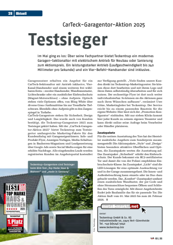 KONTAKTTeckentrup GmbH & Co. KGIndustriestra%u00dfe 50, 33415 Verl-S%u00fcrenheideTel. +49 (0)5246 5040www.teckentrup.bizCarTeck-Garagentor-Aktion 2025TestsiegerIm Mai ging es los: %u00dcber seine Fachpartner bietet Teckentrup ein modernes Garagen-Sektionaltor mit elektrischem Antrieb f%u00fcr Neubau oder Sanierung zum Aktionspreis. Ein leistungsstarker Antrieb (Laufgeschwindigkeit bis 240 Millimeter pro Sekunde) und ein Vier-Befehl-Handsender sind inklusive.Garagennutzer erhalten ein Angebot f%u00fcr ein CarTeck-Sektionaltor mit Antrieb inklusive, VierKanal-Handsender und einem weiteren frei w%u00e4hlbaren Extra %u2013 zweiter Handsender, Wandinnentaster, Lichtschranke oder ein zus%u00e4tzlicher Einbruchschutz (Magnet-Motorschloss) %u2013 ohne Aufpreis. Optisch stehen viele Optionen offen, von Bling White %u00fcber diverse Grau-/Anthrazitt%u00f6ne bis zur Trendfarbe Tiefschwarz. Ebenfalls ohne Aufpreis gibt es den Zargenspiegel in Torfarbe. CarTeck-Garagentore stehen f%u00fcr Sicherheit, Design und Langlebigkeit. Das wurde auch von Kunden best%u00e4tigt, die Teckentrup-Garagentore 2025 zum Testsieger gek%u00fcrt haben. Mit der %u201eCarTeck-Garagentor-Aktion 2025%u201c bietet Teckentrup zum Testsiegertor umfangreiche Marketing-Pakete f%u00fcr den Kundendialog mit Garageneigent%u00fcmern. Info- und Produkt-Flyer, Anzeigen-Vorlagen, Media-Schaltungen in Bauherren-Magazinen und Leadgenerierung %u00fcber Google Ads sowie Social Media sorgen f%u00fcr eine erh%u00f6hte Nachfrage. Alle eingehenden Leads werden registrierten Kunden im Angebotsportal kostenfrei zur Verf%u00fcgung gestellt. %u201eViele finden unsere Kunden direkt im Teckentrup-Marketingcenter. Sie k%u00f6nnen diese dort bearbeiten und mit ihrem Logo und ihren Daten selbstst%u00e4ndig %u00fcberarbeiten und f%u00fcr sich nutzen. Der sechsseitige Flyer ist dort noch weiter individualisierbar. So k%u00f6nnen sie die Aktionen ganz nach ihren W%u00fcnschen aufbauen%u201c, res%u00fcmiert Uwe G%u00f6tze, Marketingleiter bei Teckentrup. Der Service reicht bis zu einem passenden Baustein f%u00fcr die eigene Website: Hier l%u00e4sst sich der %u201ePromotion-Konfigurator%u201c einbinden. Mit nur sieben Klicks kommt hier jeder Kunde zu seinem eigenen Traumtor und kann direkt online seine Anfrage beim Verarbeiter oder H%u00e4ndler platzieren.ZusatzpaketeF%u00fcr die weitere Ausstattung des Tors hat der Hersteller zus%u00e4tzliche Angebote zum Sonderpreis zusammengestellt: Die Aktionspakete %u201eStyle%u201c und %u201eDesign%u201c bieten besonders attraktive Oberfl%u00e4chen und Optiken, die Zusatzpakete werten die Ausstattung auf. Das Zusatzpaket %u201eSicherheit%u201c erh%u00f6ht den Einbruchschutz. Der Kunde bekommt ein RC2-zertifiziertes Tor und damit die von der Polizei empfohlene Einbruchschutz-Klasse. Im Zusatzpaket %u201eLicht%u201c sind die LED-L%u00f6sungen f%u00fcr eine optimale Ausleuchtung vor und in der Garage zusammengefasst. Die Innen- und Au%u00dfenbeleuchtung kann einzeln oder im Duo dazu gebucht werden. Das %u201eKomfort%u201c-Zusatzpaket umfasst einen zus%u00e4tzlichen Wandtaster, der per Code und ohne Stromanschluss bequemes %u00d6ffnen und Schlie%u00dfen des Tores erm%u00f6glicht. Mit dieser Angebotsbreite findet jede Baufamilie das f%u00fcr sie passende Tor. Die Aktion l%u00e4uft vom 01. Mai 2025 bis zum 28. Februar 2026. yFoto: Teckentrup28Aktuell03|25Teckentrup-Garagentore sind Testsieger beim Bild-Test %u201eTop Marke Haus & Wohnen%u201c und %u201emade in Germany%u201d