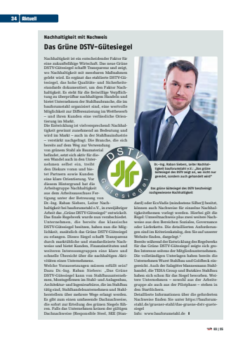 Nachhaltigkeit ist ein entscheidender Faktor f%u00fcr eine zukunftsf%u00e4hige Wirtschaft. Das neue Gr%u00fcne DSTV-G%u00fctesiegel schafft Transparenz und zeigt, wo Nachhaltigkeit mit messbaren Ma%u00dfnahmen gelebt wird. Es erg%u00e4nzt das etablierte DSTV-G%u00fctesiegel, das hohe Qualit%u00e4ts- und Sicherheitsstandards dokumentiert, um den Faktor Nachhaltigkeit. Es steht f%u00fcr die freiwillige Verpflichtung zu %u00fcberpr%u00fcfbar nachhaltigem Handeln und bietet Unternehmen der Stahlbaubranche, die im bauforumstahl organisiert sind, eine wertvolle M%u00f6glichkeit zur Differenzierung im Wettbewerb %u2013 und ihren Kunden eine verl%u00e4ssliche Orientierung im Markt.Die Entwicklung ist vielversprechend: Nachhaltigkeit gewinnt zunehmend an Bedeutung und wird im Markt %u2013 auch in der Stahlbauindustrie %u2013 verst%u00e4rkt nachgefragt. Die Branche, die sich bereits auf dem Weg zur Verwendung von gr%u00fcnem Stahl als Baumaterial befindet, setzt sich aktiv f%u00fcr diesen Wandel auch in den Unternehmen selbst ein, treibt den Diskurs voran und bietet Partnern sowie Kunden eine klare Orientierung. Vor diesem Hintergrund hat die Arbeitsgruppe Nachhaltigkeit aus dem Arbeitsausschuss Fertigung unter der Betreuung von Dr.-Ing. Raban Siebers, Leiter Nachhaltigkeit bei bauforumstahl e.V., in zweij%u00e4hriger Arbeit das %u201eGr%u00fcne DSTV-G%u00fctesiegel%u201c entwickelt. Das finale Regelwerk wurde nun verabschiedet.Unternehmen, die bereits das klassische DSTV-G%u00fctesiegel besitzen, haben nun die M%u00f6glichkeit, zus%u00e4tzlich das Gr%u00fcne DSTV-G%u00fctesiegel zu erlangen. Dieses Siegel schafft Transparenz durch markt%u00fcbliche und standardisierte Nachweise und bietet Kunden, Finanzinstituten und weiteren Interessengruppen eine klare und schnelle %u00dcbersicht %u00fcber die nachhaltigen Aktivit%u00e4ten eines Unternehmens.Welche Voraussetzungen m%u00fcssen erf%u00fcllt sein? Dazu Dr.-Ing. Raban Siebers: %u201eDas Gr%u00fcne DSTV-G%u00fctesiegel kann von Stahlbauunternehmen, Montagefirmen im Stahl- und Anlagenbau, Architektur- und Ingenieurb%u00fcros, die im Stahlbau t%u00e4tig sind, Stahlhandelsunternehmen und Stahlherstellern %u00fcber mehrere Wege erlangt werden. Es gibt zum einen umfassende Dachnachweise, die sofort zur Erteilung des gr%u00fcnen Siegels f%u00fchren. Falls das Unternehmen keinen der g%u00fcltigen Dachnachweise (Responsible Steel, SEE (Standard) oder EcoVadis (mindestens Silber)) besitzt, k%u00f6nnen auch Nachweise f%u00fcr einzelne Nachhaltigkeitsthemen vorlegt werden. Hierbei gilt die Regel: Umweltnachweis plus zwei weitere Nachweise aus den Bereichen Soziales, Governance oder Lieferkette. Die detaillierten Anforderungen sind im Kriterienkatalog, den Sie auf unserer Website finden, dargelegt.%u201cBereits w%u00e4hrend der Entwicklung des Regelwerks f%u00fcr das Gr%u00fcne DSTV-G%u00fctesiegel zeigte sich gro%u00dfes Interesse seitens der Mitgliedsunternehmen. Die vollst%u00e4ndigen Unterlagen haben bereits die Unternehmen Wurst Stahlbau und Goldbeck eingereicht. Auch der Salzgitter Mannesmann Stahlhandel, die TEHA Group und Butzkies Stahlbau haben sich schon f%u00fcr das Siegel beworben. Weitere Unternehmen %u2013 sowohl aus der Arbeitsgruppe als auch aus der Pilotphase %u2013 stehen in den Startl%u00f6chern.Detaillierte Informationen %u00fcber die geforderten Nachweise finden Sie unter https://bauforumstahl.de/gruener-stahl/das-gruene-dstv-guetesiegel Info: www.bauforumstahl.de yDas gr%u00fcne G%u00fctesiegel des DSTV bescheinigt nachgewiesene NachhaltigkeitDr.-Ing. Raban Siebers, Leiter Nachhaltigkeit bauforumstahl e.V.: %u201eDas gr%u00fcne G%u00fctesiegel des DSTV zeigt an, wo nicht nur geredet, sondern auch gehandelt wird%u201cNachhaltigkeit mit NachweisDas Gr%u00fcne DSTV-G%u00fctesiegel34Aktuell03|25