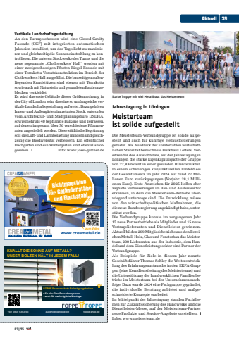 Vertikale LandschaftsgestaltungAn den Turmgeschossen wird eine Closed Cavity Fassade (CCF) mit integrierten automatischen Jalousien installiert, um das Tageslicht zu maximieren und gleichzeitig die Sonneneinstrahlung zu kontrollieren. Die unteren Stockwerke des Turms und die neue sogenannte %u201eClothworkers%u2018 Hall%u201c werden mit einer zweigeschossigen Pfosten-Riegel-Fassade mit einer Terrakotta-Vorsatzkonstruktion im Bereich der Clothworkers Hall ausgef%u00fchrt. Die bauseitigen au%u00dfenliegenden Rundst%u00fctzen sind ebenso mit Terrakotta sowie auch mit Naturstein und gerundeten Baubronzeblechen verkleidet.Es wird das erste Geb%u00e4ude dieser Gr%u00f6%u00dfenordnung in der City of London sein, das eine so umfangreiche vertikale Landschaftsgestaltung aufweist. Dazu geh%u00f6ren Innen- und Au%u00dfeng%u00e4rten im zehnten Stock, entworfen vom Architektur- und Stadtplanungsb%u00fcro DSDHA, sowie mehr als 40 bepflanzte Balkone und Terrassen, auf denen insgesamt %u00fcber 70 verschiedene Pflanzenarten angesiedelt werden. Diese st%u00e4dtische Begr%u00fcnung soll die Luft- und L%u00e4rmbelastung mindern und gleichzeitig die Biodiversit%u00e4t verbessern. Ein %u00f6ffentlicher Dachgarten und ein Wintergarten sind ebenfalls vorgesehen. y Info: www.josef-gartner.deJahrestagung in L%u00f6ningenMeisterteam ist solide aufgestelltDie Meisterteam-Verbundgruppe ist solide aufgestellt und auch f%u00fcr k%u00fcnftige Herausforderungen ger%u00fcstet. Als Ausdruck der komfortablen wirtschaftlichen Stabilit%u00e4t bezeichnete Burkhard Leffers, Vorsitzender des Aufsichtsrats, auf der Jahrestagung in L%u00f6ningen die starke Eigenkapitalquote der Gruppe von 27,8 Prozent in einer gesunden Bilanzstruktur. In einem schwierigen konjunkturellen Umfeld sei der Gesamtumsatz im Jahr 2024 auf rund 27 Millionen Euro zur%u00fcckgegangen (Vorjahr: 28,1 Millionen Euro). Erste Anzeichen f%u00fcr 2025 lie%u00dfen aber zaghafte Verbesserungen im Bau- und Ausbausektor erkennen, in dem die Meisterteam-Betriebe %u00fcberwiegend unterwegs sind. Die Entwicklung m%u00fcsse von den wirtschaftspolitischen Ma%u00dfnahmen, die die neue Bundesregierung angek%u00fcndigt habe, unterst%u00fctzt werden.Die Verbundgruppe konnte im vergangenen Jahr 15 neue Partnerbetriebe als Mitglieder und 15 neue Vertragslieferanten und Dienstleister gewinnen. Aktuell bilden 269 Mitgliedsbetriebe aus den Bereichen Metall, Holz, Glas und Fensterbau das Meisterteam, 200 Lieferanten aus der Industrie, dem Handel und dem Dienstleistungssektor sind Partner der Verbundgruppe.Als Beispiele f%u00fcr Ziele in diesem Jahr nannte Gesch%u00e4ftsf%u00fchrer Thomas Schley die Weiterentwicklung des Erfahrungsaustauschs in den ERFA-Gruppen (eine Kerndienstleitung des Meisterteams) und die Unterst%u00fctzung der handwerklichen Familienbetriebe im Meisterteam bei der Unternehmensnachfolge. Dazu wurde 2024 eine Fachgruppe gegr%u00fcndet, die individuelle Beratung anbietet und ma%u00dfgeschneiderte Konzepte erarbeitet.Im Mittelpunkt der Jahrestagung standen Fachthemen zur Zukunftssicherung des Handwerks und die Dienstleister-Messe, auf der Meisterteam-Partner neue Produkte und Service-Angebote vorstellten. yInfos: www.meisterteam.de f%u00fcr Gel%u00e4nderst%u00e4be und Flachstahlwww.creametal.dezum Video FOPPE Sonnenschutz-Befestigungsbolzen%u2022 f%u00fcr alle Glas-Fassadensysteme%u2022 auch f%u00fcr nachtr%u00e4gliche Montage KNALLT DIE SONNE AUF METALL? UNSER BOLZEN H%u00c4LT IN JEDEM FALL!+49 5904 9393-93 zubehoer@foppe.de foppe-shop.deStarke Truppe mit viel Metallbau: das MeisterteamAktuell3903|25