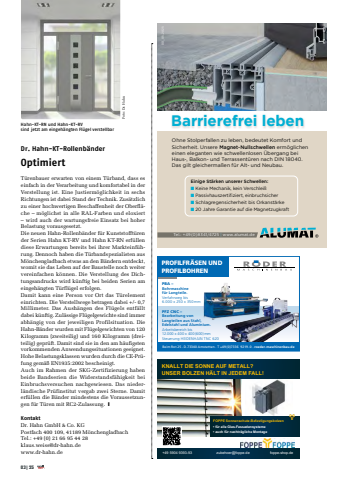 Barrierefrei lebenTel.: +49(0)8341/4725 | www.alumat.deOhne Stolperfallen zu leben, bedeutet Komfort und Sicherheit. UnsereMagnet-Nullschwellen erm%u00f6glichen einen eleganten wie schwellen losen %u00dcbergang bei Haus-, Balkon- und Terrassen t%u00fcren nach DIN 18040. Das gilt gleicherma%u00dfen f%u00fcr Alt- und Neubau.Einige St%u00e4rken unserer Schwellen: %u25a0 Keine Mechanik, kein Verschlei%u00df %u25a0 Passivhauszertifi ziert, einbruchsicher%u25a0Schlagregensicherheit bis Orkanst%u00e4rke%u25a0 20 Jahre Garantie auf die Magnetzugkraft DD_05.2025AluAnzeigen_2025.indd 10PROFILFR%u00c4SEN UND PROFILBOHRENPBA %u2013Bohrmaschine f%u00fcr Langteile.Verfahrweg bis 6.000 x 250 x 350mmPFZ CNC %u2013 Bearbeitung von Langteilen aus Stahl, Edelstahl und Aluminium.Arbeitsbereich bis12.000 x 400 x 400(600)mmSteuerung HEIDENHAIN TNC 620Beim Rot 25 . D-73340 Amstetten . T +49(0)7336 9219 - 0 . roeder-maschinenbau.deFOPPE Sonnenschutz-Befestigungsbolzen%u2022 f%u00fcr alle Glas-Fassadensysteme%u2022 auch f%u00fcr nachtr%u00e4gliche Montage KNALLT DIE SONNE AUF METALL? UNSER BOLZEN H%u00c4LT IN JEDEM FALL!+49 5904 9393-93 zubehoer@foppe.de foppe-shop.deDr. Hahn-KT-Rollenb%u00e4nderOptimiertT%u00fcrenbauer erwarten von einem T%u00fcrband, dass es einfach in der Verarbeitung und komfortabel in der Verstellung ist. Eine Justierm%u00f6glichkeit in sechs Richtungen ist dabei Stand der Technik. Zus%u00e4tzlich zu einer hochwertigen Beschaffenheit der Oberfl%u00e4che %u2013 m%u00f6glichst in alle RAL-Farben und eloxiert %u2013 wird auch der wartungsfreie Einsatz bei hoher Belastung vorausgesetzt. Die neuen Hahn-Rollenb%u00e4nder f%u00fcr Kunststofft%u00fcren der Serien Hahn KT-RV und Hahn KT-RN erf%u00fcllen diese Erwartungen bereits bei ihrer Markteinf%u00fchrung. Dennoch haben die T%u00fcrbandspezialisten aus M%u00f6nchengladbach etwas an den B%u00e4ndern entdeckt, womit sie das Leben auf der Baustelle noch weiter vereinfachen k%u00f6nnen. Die Verstellung des Dichtungsandrucks wird k%u00fcnftig bei beiden Serien am eingeh%u00e4ngten T%u00fcrfl%u00fcgel erfolgen. Damit kann eine Person vor Ort das T%u00fcrelement einrichten. Die Verstellwege betragen dabei +/- 0,7 Millimeter. Das Aush%u00e4ngen des Fl%u00fcgels entf%u00e4llt dabei k%u00fcnftig. Zul%u00e4ssige Fl%u00fcgelgewichte sind immer abh%u00e4ngig von der jeweiligen Profilsituation. Die Hahn-B%u00e4nder wurden mit Fl%u00fcgelgewichten von 120 Kilogramm (zweiteilig) und 160 Kilogramm (dreiteilig) gepr%u00fcft. Damit sind sie in den am h%u00e4ufigsten vorkommenden Anwendungssituationen geeignet. Hohe Belastungsklassen wurden durch die CE-Pr%u00fcfung gem%u00e4%u00df EN1935:2002 bescheinigt.Auch im Rahmen der SKG-Zertifizierung haben beide Bandserien die Widerstandsf%u00e4higkeit bei Einbruchsversuchen nachgewiesen. Das niederl%u00e4ndische Pr%u00fcfinstitut vergab zwei Sterne. Damit erf%u00fcllen die B%u00e4nder mindestens die Voraussetzungen f%u00fcr T%u00fcren mit RC2-Zulassung. yKontaktDr. Hahn GmbH & Co. KGPostfach 400 109, 41189 M%u00f6nchengladbachTel.: +49 (0) 21 66 95 44 28klaus.weiss@dr-hahn.dewww.dr-hahn.de Hahn-KT-RN und Hahn-KT-RV sind jetzt am eingeh%u00e4ngten Fl%u00fcgel verstellbarFoto: Dr. Hahn03|25