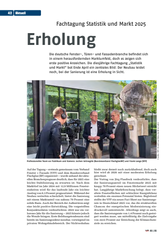 42Aktuell03|25Fachtagung Statistik und Markt 2025ErholungDie deutsche Fenster-, T%u00fcren- und Fassadenbranche befindet sich in einem herausfordernden Marktumfeld, doch es zeigen sich erste positive Anzeichen. Die diesj%u00e4hrige Fachtagung %u201eStatistik und Markt%u201c bot Ende April ein zentrales Bild: Der Neubau leidet noch, bei der Sanierung ist eine Erholung in Sicht.Auf der Tagung %u2013 erstmals gemeinsam vom Verband Fenster + Fassade (VFF) und dem Bundesverband Flachglas (BF) organisiert %u2013 wurde anhand der aktuellen Branchenprognose deutlich, dass f%u00fcr 2025 eine leichte Stabilisierung zu erwarten ist. Nach dem Markttief im Jahr 2024 mit 12,9 Millionen Fenstereinheiten wird f%u00fcr das laufende Jahr ein leichter Anstieg von 0,3 Prozent prognostiziert. W%u00e4hrend der Neubau weiterhin schw%u00e4chelt, bietet die Sanierung mit einem Marktanteil von nahezu 70 Prozent eine solide Basis. Auch der Bereich der Au%u00dfent%u00fcren zeigt eine leicht positive Entwicklung. Die vorgestellten Konjunkturdaten verdeutlichten: 2024 war ein verlorenes Jahr f%u00fcr die Sanierung %u2013 2025 k%u00f6nnte jedoch die Wende bringen. Erste Belebungstendenzen sind bereits im Sanierungssektor messbar, vorwiegend im privaten Wohngeb%u00e4udebereich. Der Nichtwohnbau bleibt zwar derzeit noch zur%u00fcckhaltend, doch auch hier wird ab 2026 mit einer moderaten Erholung gerechnet.Der Vortrag von J%u00f6rg Flasdieck verdeutlichte, dass der Sanierungsanteil im Fenstermarkt 2025 mit knapp 70 Prozent einen neuen H%u00f6chstwert erreicht hat. Langj%u00e4hrige Marktforschung belegt, dass veraltete Fensterfl%u00e4chen mit schlechter Energiebilanz weiterhin ein enormes Potenzial bieten. Begleitend stellte der VFF ein neues Fact Sheet zur Sanierungsrate in Deutschland 2025 vor, das die strukturellen Chancen der energetischen Modernisierung eindrucksvoll unterstreicht. Allerdings zeigt es auch, dass die Sanierungsrate von 1,4 Prozent noch gesteigert werden muss, um mittelfristig die Zielvorgabe von zwei Prozent zur Erreichung der Klimaschutzziele zu erreichen.Professionelles Team vor Publikum und Kamera: Jochen Gr%u00f6negr%u00e4s (Bundesverband Flachglas/BF) und Frank Lange (VFF)Credits: VFF / Book Your Video GmbH & Co.KG