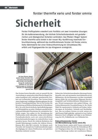 forster thermfix vario und forster omniaSicherheitForster Profilsysteme erweitert sein Portfolio um zwei innovative L%u00f6sungen f%u00fcr die Au%u00dfenanwendung, die h%u00f6chste Sicherheitsstandards mit gestalterischen und %u00f6kologischen Vorteilen verbinden: Das Pfosten-Riegel-System forster thermfix vario bietet in der neuen RC4-Ausf%u00fchrung maximale Einbruchhemmung, w%u00e4hrend das multifunktionale Fenster mit forster omnia hohe D%u00e4mmwerte bei einer Einbruchhemmung bis Schutzklasse RC3 erf%u00fcllt und Fl%u00fcgelgewichte bis 250 Kilogramm erm%u00f6glicht. Das System forster thermfix vario ist speziell f%u00fcr die Anwendung in anspruchsvollen Pfosten-Riegel-Fassaden konzipiert und verbindet gestalterische Freiheit mit technischer Exzellenz. Das System bietet einen funktional vielf%u00e4ltigen Werkzeugkasten f%u00fcr die kreative Fassadengestaltung. Neu ist im System die Erweiterung auf Einbruchhemmung bis Schutzklasse RC4. Sie wird durch dreifache Spezialbefestigungen und Klemmkl%u00f6tze an jeder Glaskante gew%u00e4hrleistet, w%u00e4hrend Edelstahl-Pressleisten f%u00fcr zus%u00e4tzliche Stabilit%u00e4t sorgen. Von au%u00dfen ist die Verst%u00e4rkung der Profilsysteme nicht erkennbar, sodass sich einzelne Fassadenabschnitte auch mit unterschiedlichen Sicherheitsanforderungen im einheitlichen Look gestalten lassen. Durch die einfache Reduktion der Anzahl Befestigungen werden die tieferen Schutzklassen RC2 oder RC3 erreicht. So k%u00f6nnen auch Fassaden mit komplexen Funktionsanforderungen durchg%u00e4ngig mit einem Profilsystem und gleichen Bauteilen realisiert werden. Neben den Sicherheitsmerkmalen %u00fcberzeugt forster thermfix vario mit minimalen Ansichtsbreiten ab 45 Millimetern, die bei Elementen von %u00fcber viereinhalb Metern H%u00f6he f%u00fcr ein besonders filigranes Erscheinungsbild und lichtdurchflutete Innenr%u00e4ume sorgen. Ob mit transparenter oder opaker F%u00fcllung %u2013 die einbruchhemmende Fassadenl%u00f6sung ist die ideale Wahl f%u00fcr repr%u00e4sentative Geb%u00e4ude mit hohen Anforderungen an Sicherheit, %u00c4sthetik und Nachhaltigkeit. Das recycelbare System ist nicht zuletzt aus 100 Prozent Stahl gefertigt, optional in Low Carbon Emission Steel verf%u00fcgbar und tr%u00e4gt so zur Reduzierung des CO2-Fu%u00dfabdrucks von Geb%u00e4uden bei.Einbruchhemmendes Fenster mit W%u00e4rmed%u00e4mmung: forster omnia RC3Im System forster omnia stellt Forster erstmals ein einbruchhemmendes Fenster der Schutzklasse RC3 mit Fl%u00fcgelgewichten bis 250 Kilogramm vor. Das System %u00fcberzeugt zudem mit exzellenten D%u00e4mmFotos: Forster ProfilsystemeMit dem Pfosten-RiegelSystem forster thermfix vario mit Einbruchhemmung RC4 stellt Forster eine Fassadenl%u00f6sung f%u00fcr repr%u00e4sentative Geb%u00e4ude vor, die hohen Anforderungen an Sicherheit, %u00c4sthetik und Nachhaltigkeit gerecht wird48Werkstatt03|25