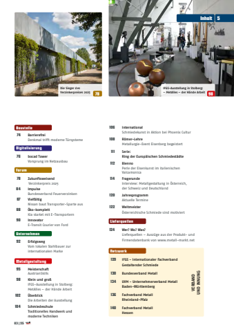 VERBAND UND INNUNGBaustelle74BarrierefreiDenkmal trifft moderne T%u00fcrsystemeDigitalisierung76bocad TowerVorsprung im NetzausbauForum78ZukunftsweisendVerzinkerpreis 202584ImpulseBundesverband Feuerverzinken87Vielf%u00e4ltigNissan baut Transporter-Sparte aus88%u00d6ko-komplettKia startet mit E-Transportern90InnovatorE-Transit Courier von FordUnternehmen92ErfolgswegVom lokalen Stahlbauer zur internationalen MarkeMetallgestaltung95MeisterschaftAustrianSkills98Klein und gro%u00df IFGS-Ausstellung in Stolberg: MetAlles %u2013 der H%u00e4nde Arbeit102%u00dcberblickDie Arbeiten der Ausstellung104SchmiedeschuleTraditionelles Handwerk undmoderne Techniken106InternationalSchmiedekunst in Aktion bei Phoenix Cultur108R%u00f6mer-LehreMetallurgie-Event Eisenberg begeistert111Serie: Ring der Europ%u00e4ischen Schmiedest%u00e4dte112BiennoPerle der Eisenkunst im italienischen Valcamonica114FragerundeIntervie Metallgestaltung in %u00d6sterreich, der Schweiz und Deutschland120JahresprogrammAktuelle Termine122Weltmeister%u00d6sterreichische Schmiede sind motiviertLieferquellen124Wer? Wo? Was?Lieferquellen %u2013 Ausz%u00fcge aus der Produkt- und Firmendatenbank von www.metall-markt.netNetzwerk129IFGS - Internationaler Fachverband Gestaltender Schmiede130Bundesverband Metall134UVM - Unternehmerverband Metall Baden-W%u00fcrttemberg136Fachverband Metall Rheinland-Pfalz140Fachverband Metall HessenIFGS-Ausstellung in Stolberg: %u2013 MetAlles %u2013 der H%u00e4nde ArbeitDie Sieger desVerzinkerpreises 20257898Inhalt503|25