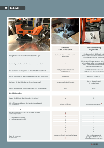 Schlosserei Gebr. Decker GmbHMetallverarbeitung LingenfelderWas gef%u00e4llt Ihnen an der Maschine besonders gut?Sie ist sehr %u00fcbersichtlich und klar konstruiertDie Ergonomische Griffigkeit und der solide Eindruck. Der Sanftanlaufauch eine sehr positive EigenschafWelche Eigenschaften oder Funktionen vermissen Sie?keineIch w%u00fcsste nicht, was an einer Stichsfehlen w%u00fcrde. Au%u00dfer dass man sie %u00fceinen Tracker bzw. Bluetooth gegeDiebstahl sichern k%u00f6nnteWie beurteilen Sie insgesamt die Robustheit der Maschine?Die S%u00e4ge ist sehr robust und stabil gebautSie macht einen sehr soliden Eindruck und ist gut verarbeitetWie oft haben Sie die Maschine w%u00e4hrend des Tests eingesetzt?gelegentlichMehrmals pro WocheWo haben Sie die Stichs%u00e4ge vorwiegend eingesetzt?vorwiegend in der WerkstattAuf der Buastelle und in der WerkstattWelche Nachteile hat die Stichs%u00e4ge nach Ihrer Einsch%u00e4tzung?keinekeineZubeh%u00f6r/S%u00e4gebl%u00e4tterNutzen Sie Original-S%u00e4gebl%u00e4tter des Herstellers?jajaWie zufrieden sind Sie mit der Standzeit und Qualit%u00e4t der S%u00e4gebl%u00e4tter?Ich war zufriedenIch war sehr zufrieden 1GesamtbewertungWie wahrscheinlich ist es, dass Sie diese Stichs%u00e4ge weiterempfehlen? 1 = sehr wahrscheinlich10 = sehr unwahrscheinlich1 23 4 5 6 7 89 1023 4 5 6 7 89 10Platz f%u00fcr besondere Kommentare:insgesamt ein sehr stabiles Werkzeug 2Eine rundum gute und gelungene Maschine. Sehr laufruhig und vibrationsarm152Werkstatt03|25