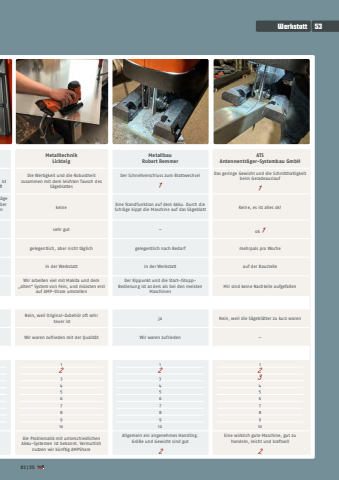 Metalltechnik LickteigMetallbau Robert RemmerATS Antennentr%u00e4ger-Systembau GmbHDie Wertigkeit und die Robustheit zusammen mit dem leichten Tausch des S%u00e4geblattesDer Schnellverschluss zum Blattwechsel 1Das geringe Gewicht und die Schnitthaltigkeit beim Geradeauslauf 1keineEine Standfunktion auf dem Akku. Durch die Schr%u00e4ge kippt die Maschine auf das S%u00e4geblattKeine, es ist alles ok!sehr gutok 1gelegentlich, aber nicht t%u00e4glichgelegentlich nach Bedarfmehrpals pro Wochein der Werkstattin der Werkstattauf der BaustelleWir arbeiten viel mit Makita und dem %u201ealten%u201c System von Fein, und m%u00fcssten erst auf AMP-Share umstellenDer Kippunkt und die Start-/StoppBedienung ist anders als bei den meisten MaschinenMir sind keine Nachteile aufgefallenNein, weil Original-Zubeh%u00f6r oft sehr teuer istjaNein, weil die S%u00e4gebl%u00e4tter zu kurz warenWir waren zufrieden mit der Qualit%u00e4tWir waren zufrieden%u20131 23 4 5 6 7 89 101 23 4 5 6 7 89 101 234 5 6 7 89 10Die Problematik mit unterschiedlichen Akku-Systemen ist bekannt. Vermutlich nutzen wir k%u00fcnftig AMPShareAllgemein ein angenehmes Handling. Gr%u00f6%u00dfe und Gewicht sind gut2Eine wirklich gute Maschine, gut zu handeln, leicht und kraftvoll2Werkstatt5303|25
