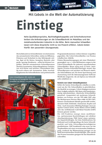 5403|25WerkstattMit Cobots in die Welt der AutomatisierungEinstiegHohe Qualit%u00e4tsanspr%u00fcche, Nachhaltigkeitsaspekte und Sicherheitsnormen treiben die Anforderungen an die Schwei%u00dftechnik im Metallbau und der metallverarbeitenden Industrie in die H%u00f6he. Beim manuellen Schwei%u00dfen lassen sich diese Anspr%u00fcche nicht zu 100 Prozent erf%u00fcllen. Cobots bieten hierf%u00fcr den passenden L%u00f6sungsansatz.Die kollaborativen Schwei%u00dfroboter revolutionieren das automatisierte Schwei%u00dfen, indem sie Effizienz, Pr%u00e4zision und Sicherheit in den Mittelpunkt stellen. Egal ob f%u00fcr kleine, komplexe Bauteile oder gro%u00dfe, sperrige Strukturen %u2013 selbst bei kleinen Losgr%u00f6%u00dfen. Obwohl automatisierte Schwei%u00dfprozesse deutlich konstantere Schwei%u00dfergebnisse erzielen, tun sich kleine und mittlere Unternehmen h%u00e4ufig noch schwer mit Automation. Hohe Anschaffungskosten f%u00fcr Schwei%u00dfroboter und professionelle Programmierkenntnisse stehen kleinen Losgr%u00f6%u00dfen gegen%u00fcber. Die Cobot-Schwei%u00dfzellen von Fronius schaffen hier Abhilfe.Pr%u00e4zise Brennerbewegungen mit einer Wiederholgenauigkeit von +/- 0,04 Millimetern sorgen in der Cobot-Schwei%u00dfzelle f%u00fcr jederzeit reproduzierbare Schwei%u00dfn%u00e4hte. Wenn n%u00f6tig auch in Serie. Intelligente Fronius-Schwei%u00dftechnologie steuert den Schwei%u00dfprozess und zeichnet auf Wunsch s%u00e4mtliche Schwei%u00dfdaten auf. F%u00fcr deren Speicherung und Auswertung wird die Datenmanagement-Software WeldCube eingesetzt, die als Option zur Schwei%u00dfzelle erh%u00e4ltlich ist.Vorteile von Cobot-Schwei%u00dfsystemenSelbst die besten Schwei%u00dfprofis schaffen es nicht, rund um die Uhr Schwei%u00dfn%u00e4hte in gleichbleibender Qualit%u00e4t zu erzeugen. Cobots hingegen meistern diese Aufgabe m%u00fchelos: Mit ihnen sind hundertprozentig reproduzierbare, identische Schwei%u00dfn%u00e4hte garantiert. Ausgestattet mit modernen Schwei%u00dfger%u00e4ten von Fronius, wie der TPS 400i CMT oder der Multiprozess-Version iWave 400i AC/DC CMT, k%u00f6nnen verschiedenste Metalle geschwei%u00dft werden, darunter Stahl, Edelstahl, Aluminium, Kupfer und Titan. Auch innovative Welding Packages wie Low Spatter Control (LSC), Pulse Multi Control (PMC) oder das weltbekannte Cold Metal Transfer (CMT) k%u00f6nnen genutzt werden.Die LSC-Funktion erzeugt einen modifizierten, spritzerarmen Kurzlichtbogen mit erh%u00f6hter Abschmelzleistung. PMC bietet einen optimierten Impulslichtbogen, bei dem Stabilisatoren f%u00fcr Einbrand und Lichtbogenl%u00e4nge die beste Schwei%u00dfqualit%u00e4t und hohe Schwei%u00dfgeschwindigkeiten gew%u00e4hrleisten. CMT kombiniert eine neue Art der Tropfenabl%u00f6se mit einer reversierenden Drahtbewegung, wodurch der W%u00e4rmeeintrag geringer ist als beim konventionellen Kurzlichtbogen. Dies macht den Prozess besonders geeignet f%u00fcr das D%u00fcnnblechschwei%u00dfen.Cobot-Schwei%u00dfsystem CWC-mobile mit Absaugung und beweglicher Einhausung zum Schwei%u00dfen von kleinen und gro%u00dfen BauteilenFotos: Fronius