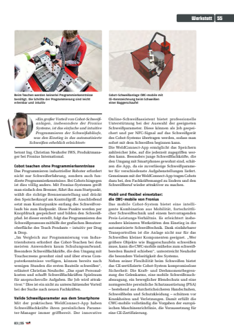 Werkstatt5503|25%u00bbEin gro%u00dfer Vorteil von Cobot-Schwei%u00dfanlagen, insbesondere der Fronius Systeme, ist das einfache und intuitive Programmieren der Schwei%u00dfabl%u00e4ufe, was den Einstieg in das automatisierte Schwei%u00dfen erheblich erleichtert%u00abbetont Ing. Christian Neuhofer IWS, Produktmanager bei Fronius International.Cobot teachen ohne ProgrammierkenntnisseDas Programmieren industrieller Roboter erfordert nicht nur Schwei%u00dferfahrung, sondern auch fundierte Programmierkenntnisse. Bei Cobots hingegen ist dies v%u00f6llig anders. Mit Fronius-Systemen greift man einfach den Brenner, f%u00fchrt ihn zum Startpunkt, w%u00e4hlt die richtige Brenneranstellung und dr%u00fcckt den Speicherknopf am Kontrollgriff. Anschlie%u00dfend setzt man Konturpunkte entlang des Schwei%u00dfverlaufs bis zum Endpunkt. Diese Punkte werden per Knopfdruck gespeichert und bilden den Schwei%u00dfpfad. Ist dieser erstellt, folgt das Programmieren des Schwei%u00dfprozesses mithilfe der grafischen Benutzeroberfl%u00e4che des Teach Pendants %u2013 intuitiv per Drag & Drop.%u201eIm Vergleich zur Programmierung von Industrierobotern erfordert das Cobot-Teachen bei den meisten Anwendern kaum Schulungsaufwand. Besonders Schwei%u00dffachkr%u00e4fte, die den Umgang mit Touchscreens gewohnt sind und %u00fcber etwas Computerkenntnisse verf%u00fcgen, k%u00f6nnen bereits nach wenigen Stunden die ersten Bauteile schwei%u00dfen%u201c, erl%u00e4utert Christian Neuhofer. %u201eDas spart Personalkosten und schafft Schwei%u00dffachkr%u00e4ften Spielraum f%u00fcr anspruchsvolle Aufgaben. Ihr Job wird attraktiver.%u201c Dies ist ein nicht zu untersch%u00e4tzender Vorteil bei der Suche nach neuen Fachkr%u00e4ften.Valide Schwei%u00dfparameter aus dem SmartphoneMit der praktischen WeldConnect-App haben Schwei%u00dffachkr%u00e4fte ihren pers%u00f6nlichen Parameter-Manager immer griffbereit. Der innovative Online-Schwei%u00dfassistent bietet professionelle Unterst%u00fctzung bei der Auswahl der geeigneten Schwei%u00dfparameter. Diese k%u00f6nnen als Job gespeichert und per NFC-Signal auf das Schwei%u00dfger%u00e4t des Cobot-Systems %u00fcbertragen werden, sodass man sofort mit dem Schwei%u00dfen beginnen kann.Die WeldConnect-App erm%u00f6glicht das Speichern zahlreicher Jobs, auf die jederzeit zugegriffen werden kann. Besonders junge Schwei%u00dffachkr%u00e4fte, die den Umgang mit Smartphones gewohnt sind, sch%u00e4tzen die App, da sie zuverl%u00e4ssige Schwei%u00dfparameter f%u00fcr verschiedenste Aufgabenstellungen liefert. Gemeinsam mit der WeldConnect-App tragen Cobots dazu bei, den Fachkr%u00e4ftemangel zu lindern und den Schwei%u00dfberuf wieder attraktiver zu machen.Mobil und flexibel einsetzbar: die CWC-mobile von FroniusDas mobile Cobot-System bietet eine intelligente Kombination aus Mobilit%u00e4t, fortschrittlicher Schwei%u00dftechnik und einem hervorragenden Preis-Leistungs-Verh%u00e4ltnis. Es erleichtert insbesondere kleineren Werkst%u00e4tten den Einstieg in die automatisierte Schwei%u00dftechnik. Dank einfahrbarer Transportrollen ist die Anlage nicht nur f%u00fcr das Schwei%u00dfen kleiner Komponenten geeignet. %u201eWer gr%u00f6%u00dfere Objekte wie Baggerschaufeln schwei%u00dfen muss, kann die CWC-mobile m%u00fchelos zum schwei%u00dfbereiten Bauteil schieben%u201c, unterstreicht Neuhofer die besondere Vielseitigkeit des Systems.Neben seiner Flexibilit%u00e4t beim Schwei%u00dfen bietet das CE-zertifizierte Cobot-System kompromisslose Sicherheit: Die Kraft- und Drehmomentbegrenzung des Gelenkarms, eine mobile Schwei%u00dfrauchabsaugung, ein beweglicher Blendschutz und eine normgerechte pers%u00f6nliche Schutzausr%u00fcstung (PSA) %u2013 bestehend aus durchstichsicheren Handschuhen, Schwei%u00dfhelm und Schutzkleidung %u2013 sch%u00fctzen vor Krankheiten und Verletzungen. Damit erf%u00fcllt die CWC-mobile vollst%u00e4ndig die Vorgaben der europ%u00e4ischen Maschinenrichtlinie, die Voraussetzung f%u00fcr eine CE-Zertifizierung.Beim Teachen werden keinerlei Programmierkenntnisse ben%u00f6tigt. Die Schritte der Programmierung sind leicht erlernbar und intuitivCobot-Schwei%u00dfanlage CWC-mobile mit CE-Kennzeichnung beim Schwei%u00dfen einer Baggerschaufel