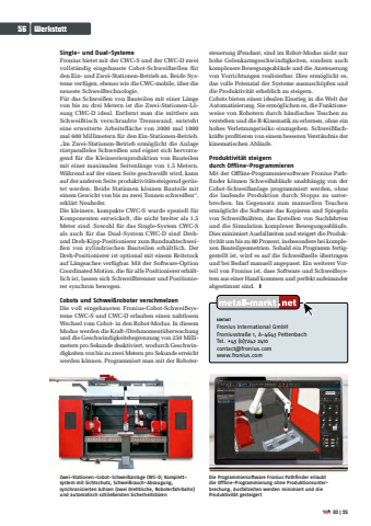 KONTAKTFronius International GmbHFroniusstra%u00dfe 1, A-4643 PettenbachTel. +43 (0)7242 2410contact@fronius.comwww.fronius.com56Werkstatt03|25Single- und Dual-Systeme Fronius bietet mit der CWC-S und der CWC-D zwei vollst%u00e4ndig eingehauste Cobot-Schwei%u00dfzellen f%u00fcr den Ein- und Zwei-Stationen-Betrieb an. Beide Systeme verf%u00fcgen, ebenso wie die CWC-mobile, %u00fcber die neueste Schwei%u00dftechnologie.F%u00fcr das Schwei%u00dfen von Bauteilen mit einer L%u00e4nge von bis zu drei Metern ist die Zwei-Stationen-L%u00f6sung CWC-D ideal. Entfernt man die mittlere am Schwei%u00dftisch verschraubte Trennwand, entsteht eine erweiterte Arbeitsfl%u00e4che von 3000 mal 1000 mal 600 Millimetern f%u00fcr den Ein-Stationen-Betrieb. %u201eIm Zwei-Stationen-Betrieb erm%u00f6glicht die Anlage r%u00fcstparalleles Schwei%u00dfen und eignet sich hervorragend f%u00fcr die Kleinserienproduktion von Bauteilen mit einer maximalen Seitenl%u00e4nge von 1,5 Metern. W%u00e4hrend auf der einen Seite geschwei%u00dft wird, kann auf der anderen Seite produktivit%u00e4tssteigernd ger%u00fcstet werden. Beide Stationen k%u00f6nnen Bauteile mit einem Gewicht von bis zu zwei Tonnen schwei%u00dfen%u201c, erkl%u00e4rt Neuhofer.Die kleinere, kompakte CWC-S wurde speziell f%u00fcr Komponenten entwickelt, die nicht breiter als 1,5 Meter sind. Sowohl f%u00fcr das Single-System CWC-S als auch f%u00fcr das Dual-System CWC-D sind Drehund Dreh-Kipp-Positionierer zum Rundnahtschwei%u00dfen von zylindrischen Bauteilen erh%u00e4ltlich. Der Dreh-Positionierer ist optional mit einem Reitstock auf L%u00e4ngsachse verf%u00fcgbar. Mit der Software-Option Coordinated Motion, die f%u00fcr alle Positionierer erh%u00e4ltlich ist, lassen sich Schwei%u00dfbrenner und Positionierer synchron bewegen. Cobots und Schwei%u00dfroboter verschmelzenDie voll eingehausten Fronius-Cobot-Schwei%u00dfsysteme CWC-S und CWC-D erlauben einen nahtlosen Wechsel vom Cobot- in den Robot-Modus. In diesem Modus werden die Kraft-/Drehmoment%u00fcberwachung und die Geschwindigkeitsbegrenzung von 250 Millimetern pro Sekunde deaktiviert, wodurch Geschwindigkeiten von bis zu zwei Metern pro Sekunde erreicht werden k%u00f6nnen. Programmiert man mit der Robotersteuerung iPendant, sind im Robot-Modus nicht nur hohe Gelenkarmgeschwindigkeiten, sondern auch komplexere Bewegungsabl%u00e4ufe und die Ansteuerung von Vorrichtungen realisierbar. Dies erm%u00f6glicht es, das volle Potenzial der Systeme auszusch%u00f6pfen und die Produktivit%u00e4t erheblich zu steigern.Cobots bieten einen idealen Einstieg in die Welt der Automatisierung. Sie erm%u00f6glichen es, die Funktionsweise von Robotern durch h%u00e4ndisches Teachen zu verstehen und die R-Kinematik zu erlernen, ohne ein hohes Verletzungsrisiko einzugehen. Schwei%u00dffachkr%u00e4fte profitieren von einem besseren Verst%u00e4ndnis der kinematischen Abl%u00e4ufe.Produktivit%u00e4t steigern durch Offline-ProgrammierenMit der Offline-Programmiersoftware Fronius Pathfinder k%u00f6nnen Schwei%u00dfabl%u00e4ufe unabh%u00e4ngig von der Cobot-Schwei%u00dfanlage programmiert werden, ohne die laufende Produktion durch Stopps zu unterbrechen. Im Gegensatz zum manuellen Teachen erm%u00f6glicht die Software das Kopieren und Spiegeln von Schwei%u00dfn%u00e4hten, das Erstellen von Suchfahrten und die Simulation komplexer Bewegungsabl%u00e4ufe. Dies minimiert Ausfallzeiten und steigert die Produktivit%u00e4t um bis zu 80 Prozent, insbesondere bei komplexen Bauteilgeometrien. Sobald ein Programm fertiggestellt ist, wird es auf die Schwei%u00dfzelle %u00fcbertragen und bei Bedarf manuell angepasst. Ein weiterer Vorteil von Fronius ist, dass Software und Schwei%u00dfsystem aus einer Hand kommen und perfekt aufeinander abgestimmt sind. yZwei-Stationen-Cobot-Schwei%u00dfanlage CWC-D; Komplettsystem mit Sichtschutz, Schwei%u00dfrauch-Absaugung, synchronisierten Achsen (zwei Drehtische, Roboterfahrbahn) und automatisch schlie%u00dfenden Sicherheitst%u00fcrenDie Programmiersoftware Fronius Pathfinder erlaubt die Offline-Programmierung ohne Produktionsunterbrechung. Ausfallzeiten werden minimiert und die Produktivit%u00e4t gesteigert