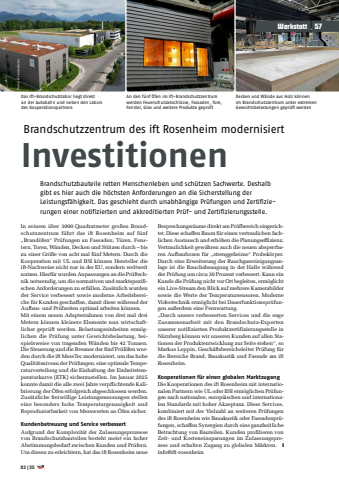 Das ift-Brandschutzlabor liegt direkt an der Autobahn und neben den Labors des KooperationspartnersAn den f%u00fcnf %u00d6fen im ift-Brandschutzzentrum werden Feuerschutzabschl%u00fcsse, Fassaden, Tore, Fenster, Glas und weitere Produkte gepr%u00fcftDecken und W%u00e4nde aus Holz k%u00f6nnen im Brandschutzzentrum unter extremen Gewichtsbelastungen gepr%u00fcft werdenWerkstatt5703|25Brandschutzzentrum des ift Rosenheim modernisiertInvestitionenIn seinem %u00fcber 3000Quadratmeter gro%u00dfen Brandschutzzentrum f%u00fchrt das ift Rosenheim auf f%u00fcnf %u201eBrand%u00f6fen%u201c Pr%u00fcfungen an Fassaden, T%u00fcren, Fenstern, Toren, W%u00e4nden, Decken und St%u00fctzen durch %u2013 bis zu einer Gr%u00f6%u00dfe von achtmalf%u00fcnf Metern. Durch dieKooperation mit UL und BSI k%u00f6nnen Hersteller die ift-Nachweise nicht nur in der EU, sondern weltweit nutzen. Hierf%u00fcr wurden Anpassungen an die Pr%u00fcftechnik notwendig, um die normativen und marktspezifischen Anforderungen zu erf%u00fcllen. Zus%u00e4tzlich wurden der Service verbessert sowie moderne Arbeitsbereiche f%u00fcr Kunden geschaffen, damit diese w%u00e4hrend der Aufbau- und Pr%u00fcfzeiten optimal arbeiten k%u00f6nnen.Mit einem neuen Adapterrahmen von drei mal drei Metern k%u00f6nnen kleinere Elemente nun wirtschaftlicher gepr%u00fcft werden. Belastungseinheiten erm%u00f6glichen die Pr%u00fcfung unter Gewichtsbelastung, beispielsweise von tragenden W%u00e4nden bis 42 Tonnen. Die Steuerung und die Brenner der f%u00fcnf Pr%u00fcf%u00f6fen wurden durch die ift MessTec modernisiert, um das hohe Qualit%u00e4tsniveau der Pr%u00fcfungen, eine optimale Temperaturverteilung und die Einhaltung der Einheitstemperaturkurve (ETK) sicherzustellen. Im Januar 2025 konnte damit die alle zwei Jahre verpflichtende Kalibrierung der %u00d6fen erfolgreich abgeschlossen werden. Zus%u00e4tzliche freiwillige Leistungsmessungen stellen eine besonders hohe Temperaturgenauigkeit und Reproduzierbarkeit von Messwerten an %u00d6fen sicher.Kundenbetreuung und Service verbessertAufgrund der Komplexit%u00e4t der Zulassungsprozesse von Brandschutzbauteilen besteht meist ein hoher Abstimmungsbedarf zwischen Kunden und Pr%u00fcfern. Um diesen zu erleichtern, hat das ift Rosenheim neue Besprechungsr%u00e4ume direkt am Pr%u00fcfbereich eingerichtet. Diese schaffen Raum f%u00fcr einen vertraulichen fachlichen Austausch und erh%u00f6hen die Planungseffizienz. Vertraulichkeit gew%u00e4hren auch die neuen absperrbaren Aufbauboxen f%u00fcr %u201estrenggeheime%u201c Probek%u00f6rper. Durch eine Erweiterung der Rauchgasreinigungsanlage ist die Rauchabsaugung in der Halle w%u00e4hrend der Pr%u00fcfung um circa 30 Prozent verbessert. Kann ein Kunde die Pr%u00fcfung nicht vor Ort begleiten, erm%u00f6glicht ein Live-Stream den Blick auf mehrere Kamerabilder sowie die Werte der Temperatursensoren. Moderne Videotechnik erm%u00f6glicht bei Dauerfunktionspr%u00fcfungen au%u00dferdem eine Fernwartung.%u201eDurch unsere verbesserten Services und die enge Zusammenarbeit mit den Brandschutz-Experten unserer notifizierten Produktzertifizierungsstelle in N%u00fcrnberg k%u00f6nnen wir unseren Kunden auf allen Stationen der Produktentwicklung zur Seite stehen%u201c, so Markus Leppin, Gesch%u00e4ftsbereichsleiter Pr%u00fcfung f%u00fcr die Bereiche Brand, Bauakustik und Fassade am ift Rosenheim.Kooperationen f%u00fcr einen globalen MarktzugangDie Kooperationen des ift Rosenheim mit internationalen Partnern wie UL oder BSI erm%u00f6glichen Pr%u00fcfungen nach nationalen, europ%u00e4ischen und internationalen Standards mit hoher Akzeptanz. Diese Services, kombiniert mit der Vielzahl an weiteren Pr%u00fcfungen des ift Rosenheim wie Bauakustik oder Fassadenpr%u00fcfungen, schaffen Synergien durch eine ganzheitliche Betrachtung von Bauteilen. Kunden profitieren von Zeit- und Kosteneinsparungen im Zulassungsprozess und erhalten Zugang zu globalen M%u00e4rkten. y info@ift-rosenheimBrandschutzbauteile retten Menschenleben und sch%u00fctzen Sachwerte. Deshalb gibt es hier auch die h%u00f6chsten Anforderungen an die Sicherstellung der Leistungsf%u00e4higkeit. Das geschieht durch unabh%u00e4ngige Pr%u00fcfungen und Zertifizierungen einer notifizierten und akkreditierten Pr%u00fcf- und Zertifizierungsstelle. Fotos: ift-rosenheim